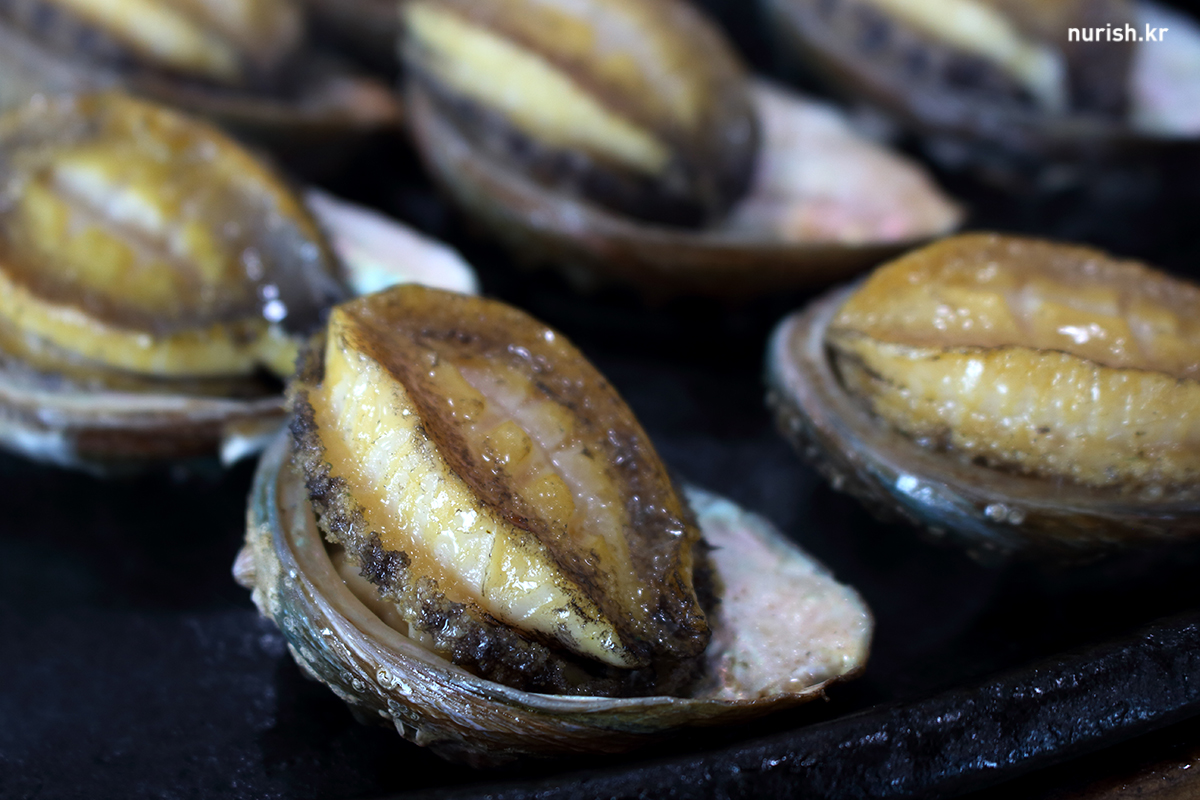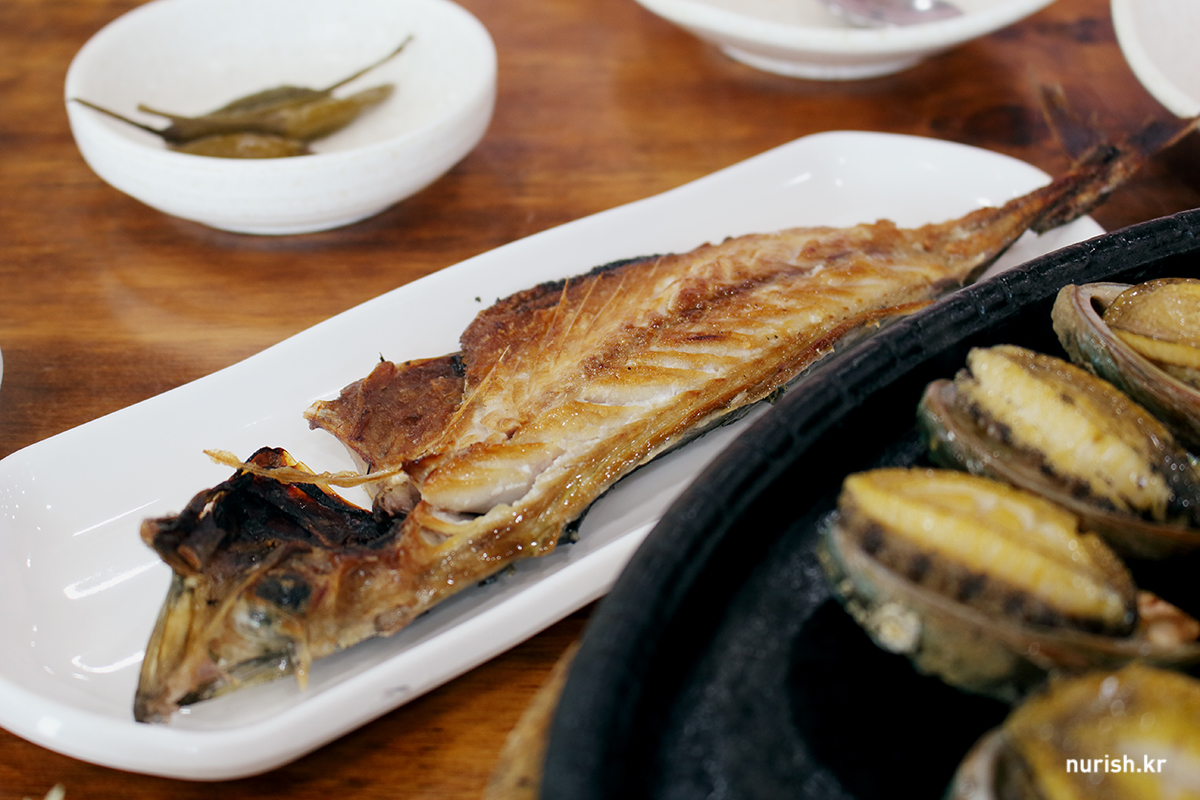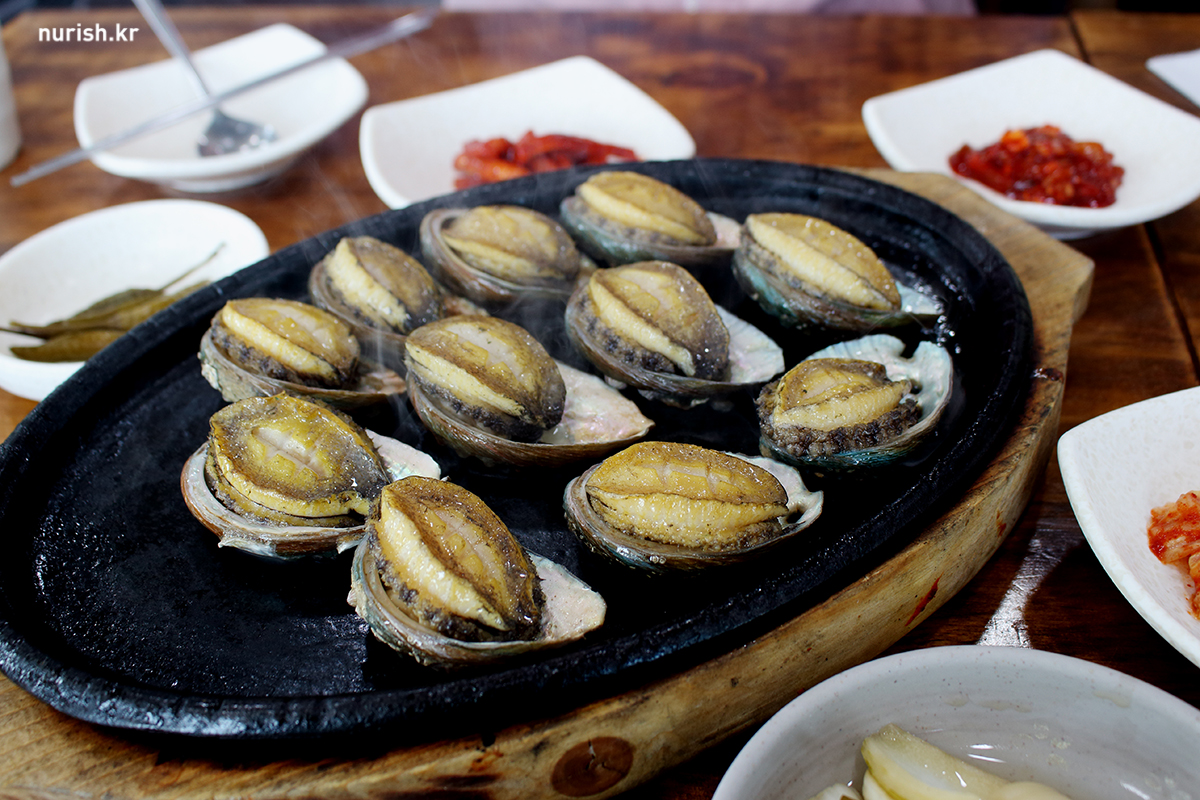 산책 도중 발견한 명진 전복, 늘 사람이 많은 곳인데 시간이 일러서인지 자리가 있어 보여서 들어가 보았다. 전복 구이 한 접시 주문.