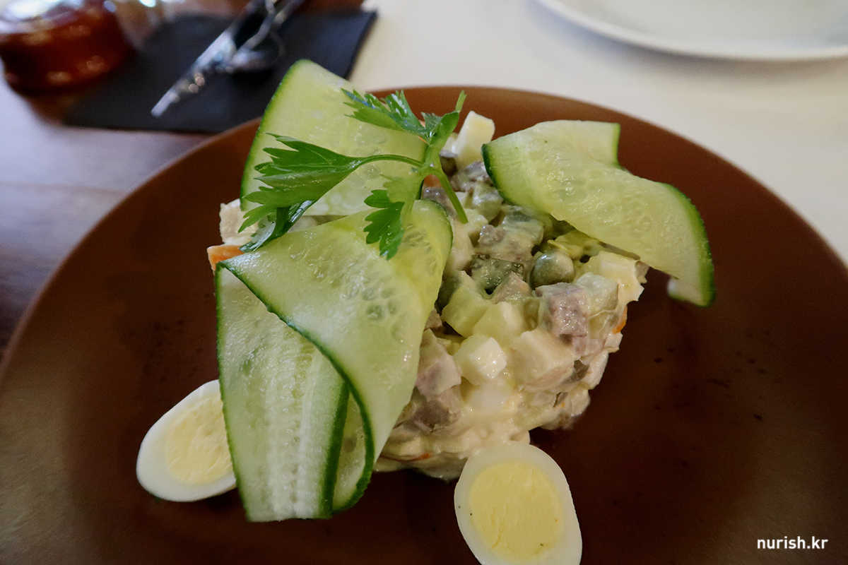 닭고기와 소고기 혀가 들어간 전통 러시아식 샐러드.