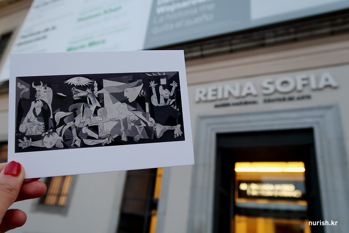 미술에 대한 조예는 깊지 않아 이번 여행에서 미술관은 배제했는데, 한참 스페인 내전에 관한 소설을 많이 읽었더니 흥미가 생겨서 피카소의 <게르니카 Guernica>만큼은 꼭 직접 보고 싶었다. 평일 저녁 7시부터 무료 입장이 가능하다고 해서 <게르니카> 보러 레이나 소피아 미술관에 들렀다.