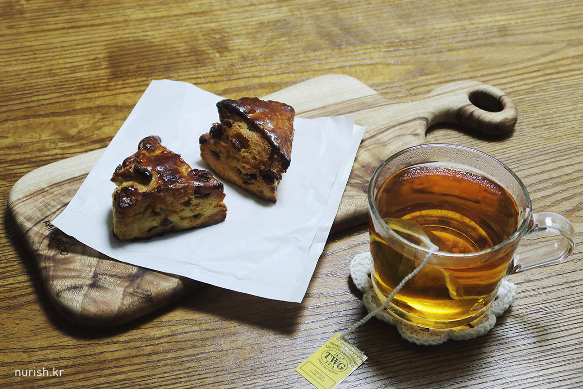 명절 연휴 첫 끼니는 폴앤폴리나에서 사온 크랜베리 스콘과 TWG 프렌치 얼그레이 한 잔.