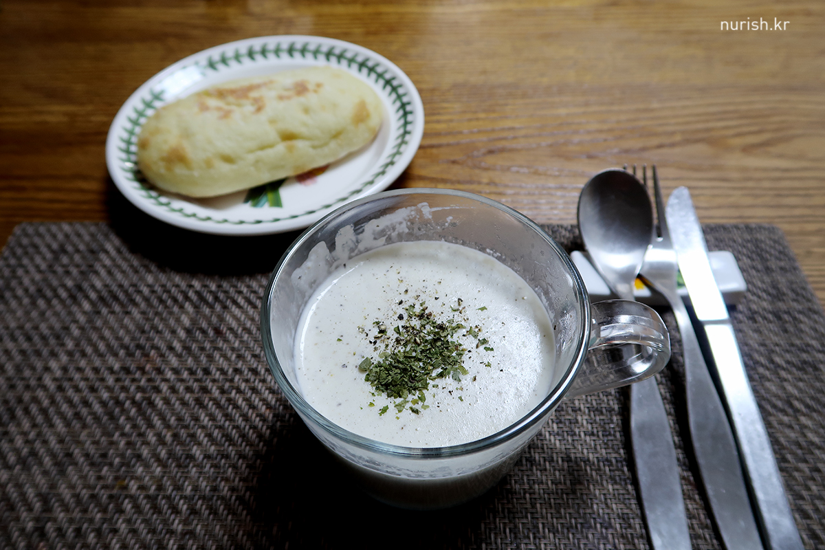 감자, 양송이, 양파, 생크림, 우유로 감자양송이수프 첫도전. 냉동실에 잠들어 있던 치아바타를 깨워서 찍어 먹는데 후후 아주 만족스럽다.