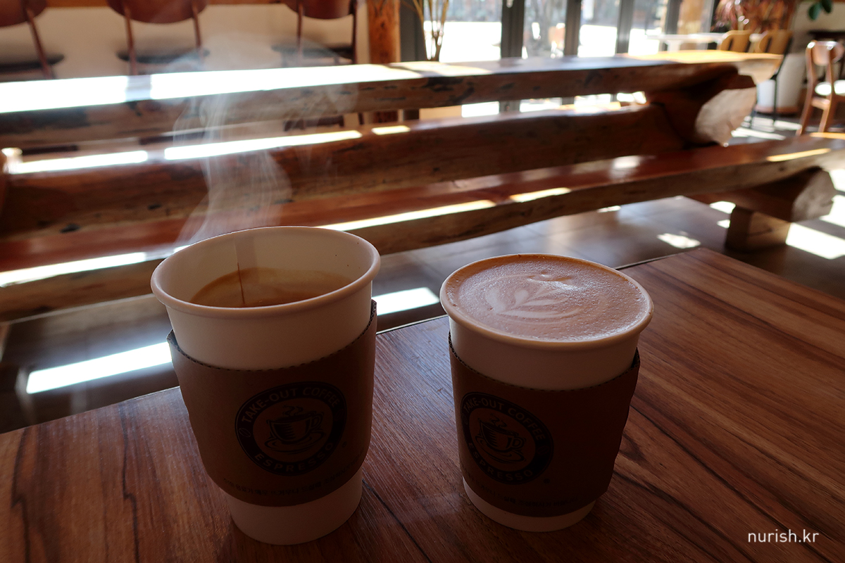 오늘도 출발 전 잠에서 완전히 깨기 위한 커피 한 잔과 뚱카롱.