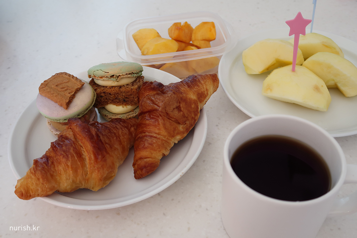 기분 좋게 해수에 몸 담그고 나와서 아침 식사.