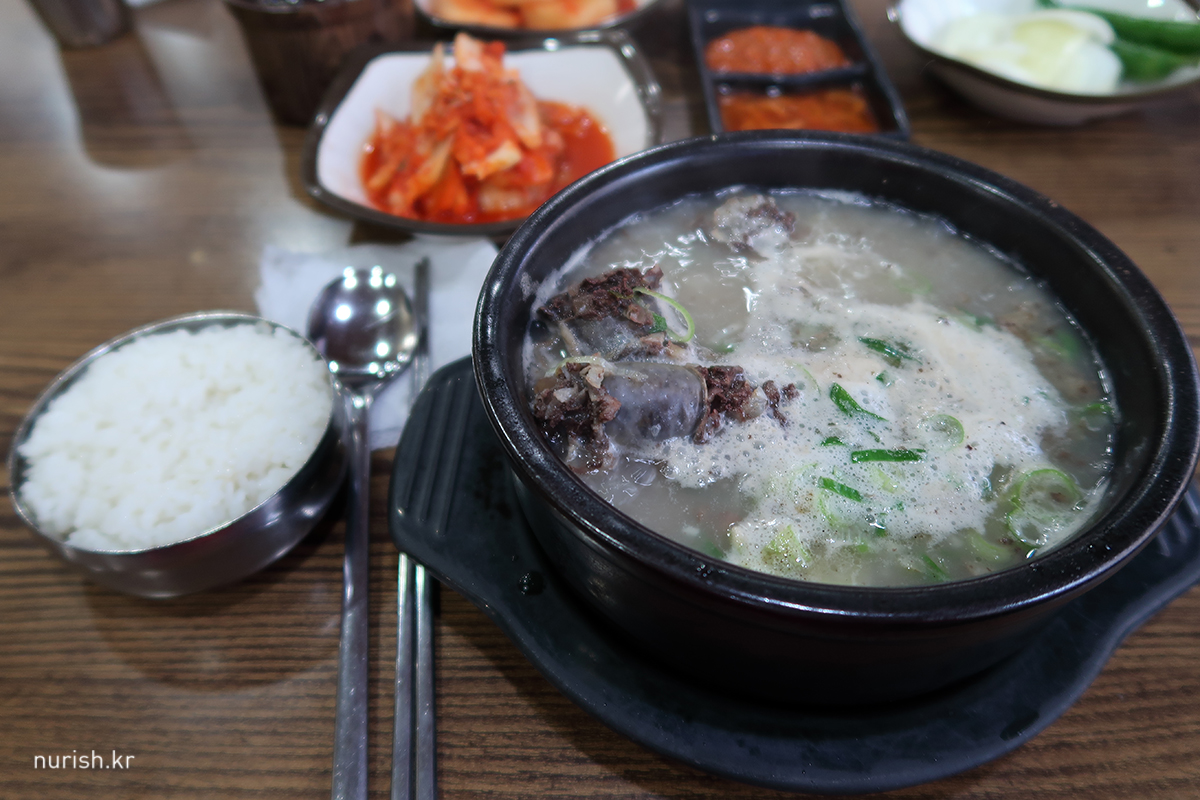 잔뜩 긴장한 채 깜깜한 고속도로를 달려 일곱 시 30분쯤 첫 목적지인 아산 지중해마을에 있는 권구성가마솥순대국밥에 도착했다. 아침식사를 할 식당이다. 은행나무길에서 가까운 곳에 있는 24시간 식당을 검색했더니 이곳이 나왔다. 신기하게도 우리가 도착했을 때 술손님들이 많았다. 왠지 이 집 맛있겠구나, 믿음이 간다. 날이 추워서 뜨끈한 음식이 좋을 듯하여 순대만 있는 순대국밥과 한우수구레국밥을 시켰다. 순대가 아주 맛있다. 다음에 기회가 되면 모듬순대나 순대복음 먹으러 다시 들르고 싶다.