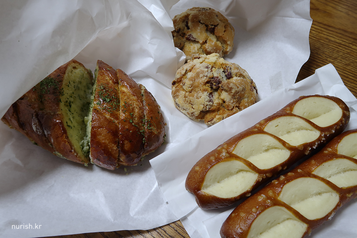 저녁은 골드로우프에서 산 빵들. 브레첼, 크랜베리 스콘, 마늘 바게뜨.