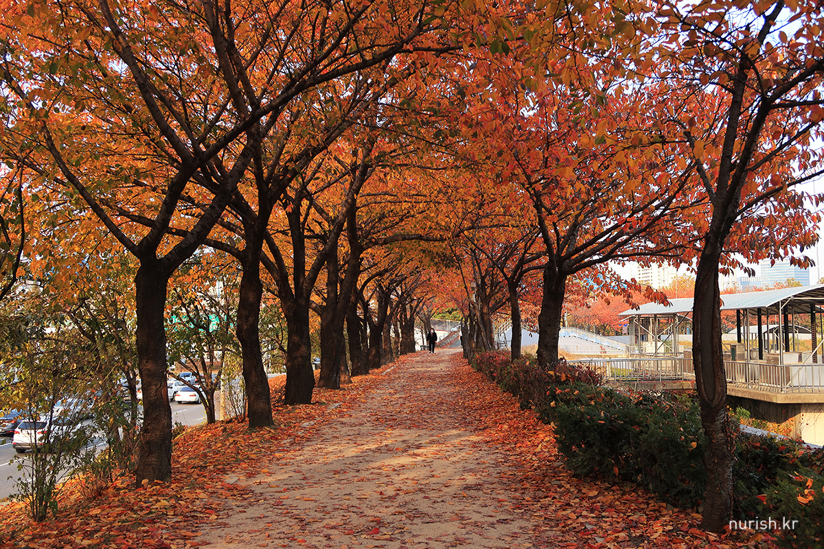벚나무 이파리들이 빨갛게 물들어 하얀 봄과는 또 다른 절경이다. 예뻐! 날도 따뜻해서인지 자전거 타는 사람도 걷는 사람도 뛰는 사람도 제법 많았다.