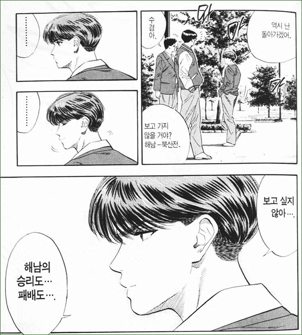 해남과 북산의 시합장 앞까지 왔던 김수겸이 '해남의 승리도, 패배도 보고 싶지 않아'라고 말하며 다시 등을 돌리는 장면이다.