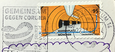 2020년 6월 10일 발행된 뮌헨(Münich) 마레인 광장(Marienplatz) 우표.