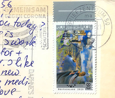 2020년 10월에 발행된 독일의 로렐라이 풍경 우표. '기다림의 바위'라는 뜻인 로렐라이는 라인 강에 있는 한 바위(132m)인데, 이 바위 위에서 물의 요정이 노래를 하면 뱃사람들이 넋을 잃고 요증을 바라보다가 암초에 부딪혀 난파당했다는 전설로 유명하다.
