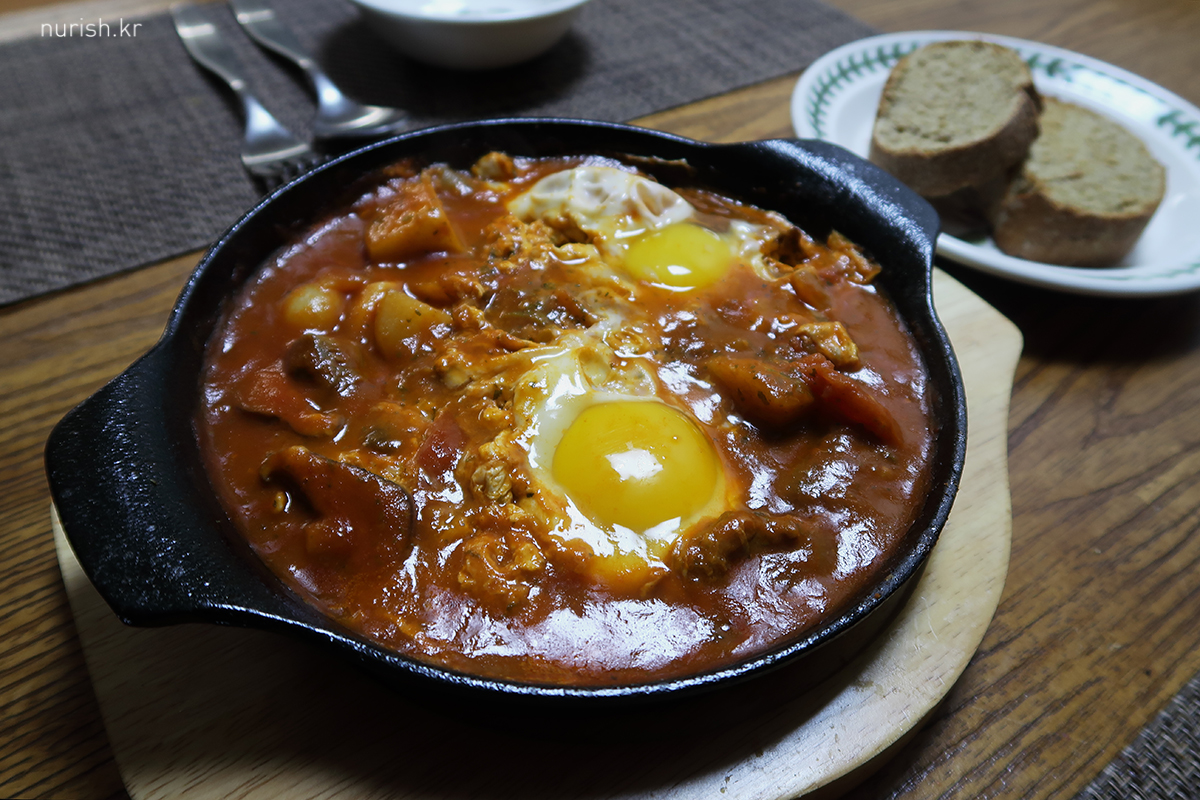 저녁에는 남은 토마토 스튜에 계란을 넣어서 에그인헬(삭슈카)로.
