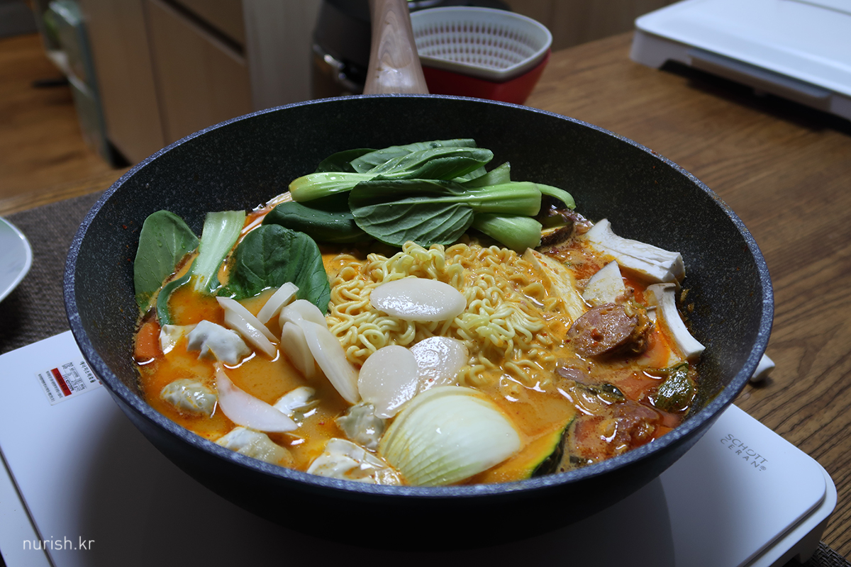 냉장실과 냉동실에서 꺼낸 각종 사리들도 넣고 팔팔 끓여 먹기