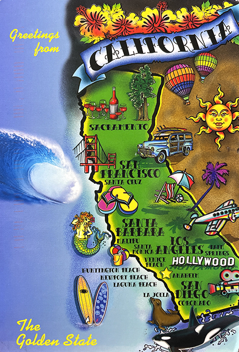 미국 샌디에이고에서 날아온 캘리포니아 주 지도 엽서! 샌디에이고는 제일 남쪽에 있다.
