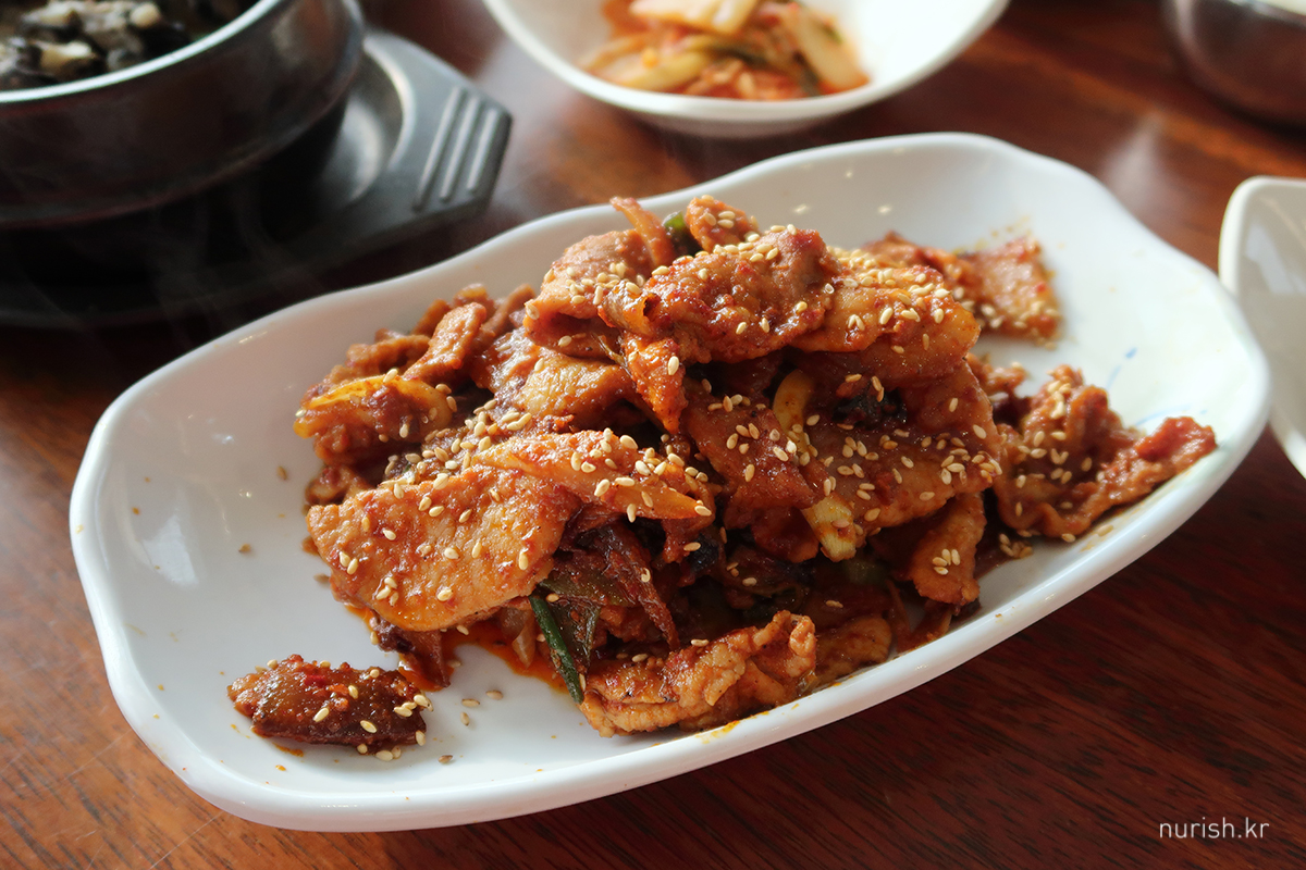 아침 먹으러 잠깐 들렀다. 우렁이쌈장 하나 시키고, 제육볶음 하나 주문