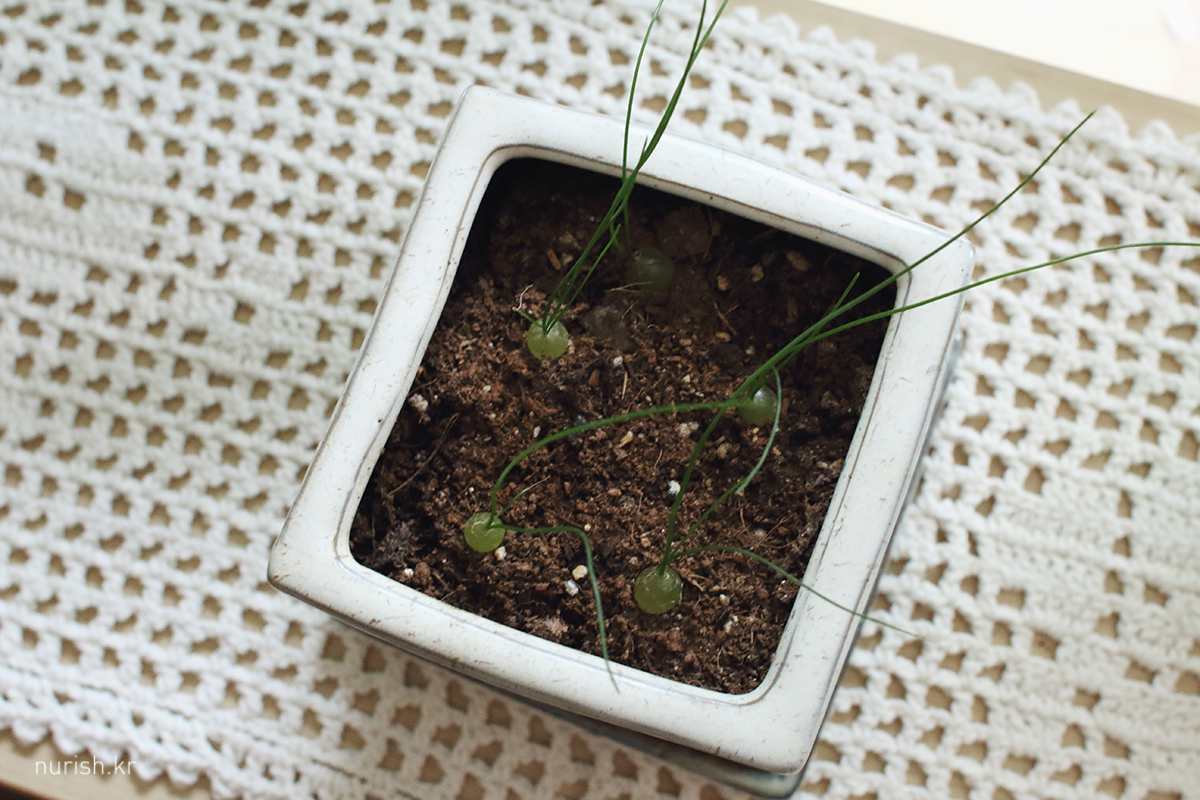 알맹이를 흙에 좀 더 파묻어 줬더니 쑥쑥 잘 자라고 있는 시조바시스 인트리카타. 인터넷 검색해 보니 아직 떡잎(?) 상태라는데, 본잎은 언제 만날 수 있을까?