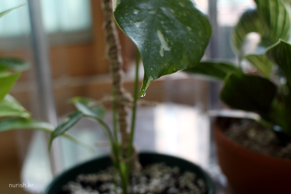 잘 적응한 건가? 이튿날 아침 바로 일액현상을 보여 주는 무늬몬 씨. 뿌리가 아주 건강한 녀석인가 보다. 물은 가볍게 닦아주고.