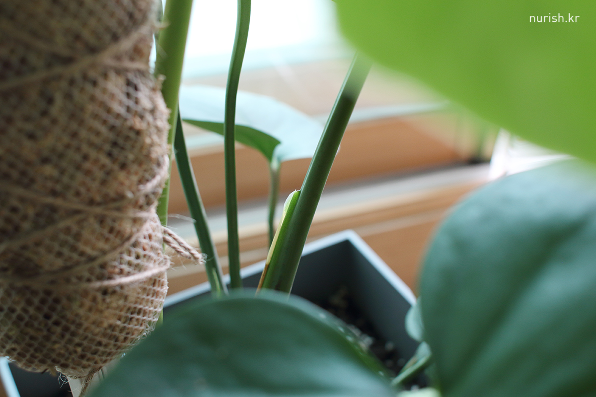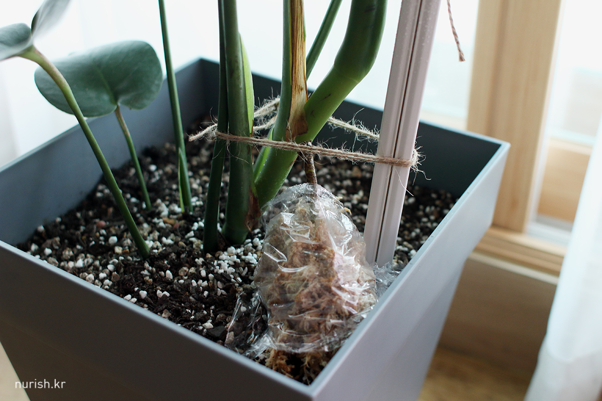 몬스테라 공기뿌리가 흙으로 가기도 전에 너무 마르는 거 같아서 수태 이불을 덮어주었다.