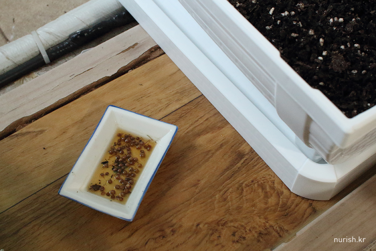 고수 씨앗을 물에 불려서 심어 보기로 했다.