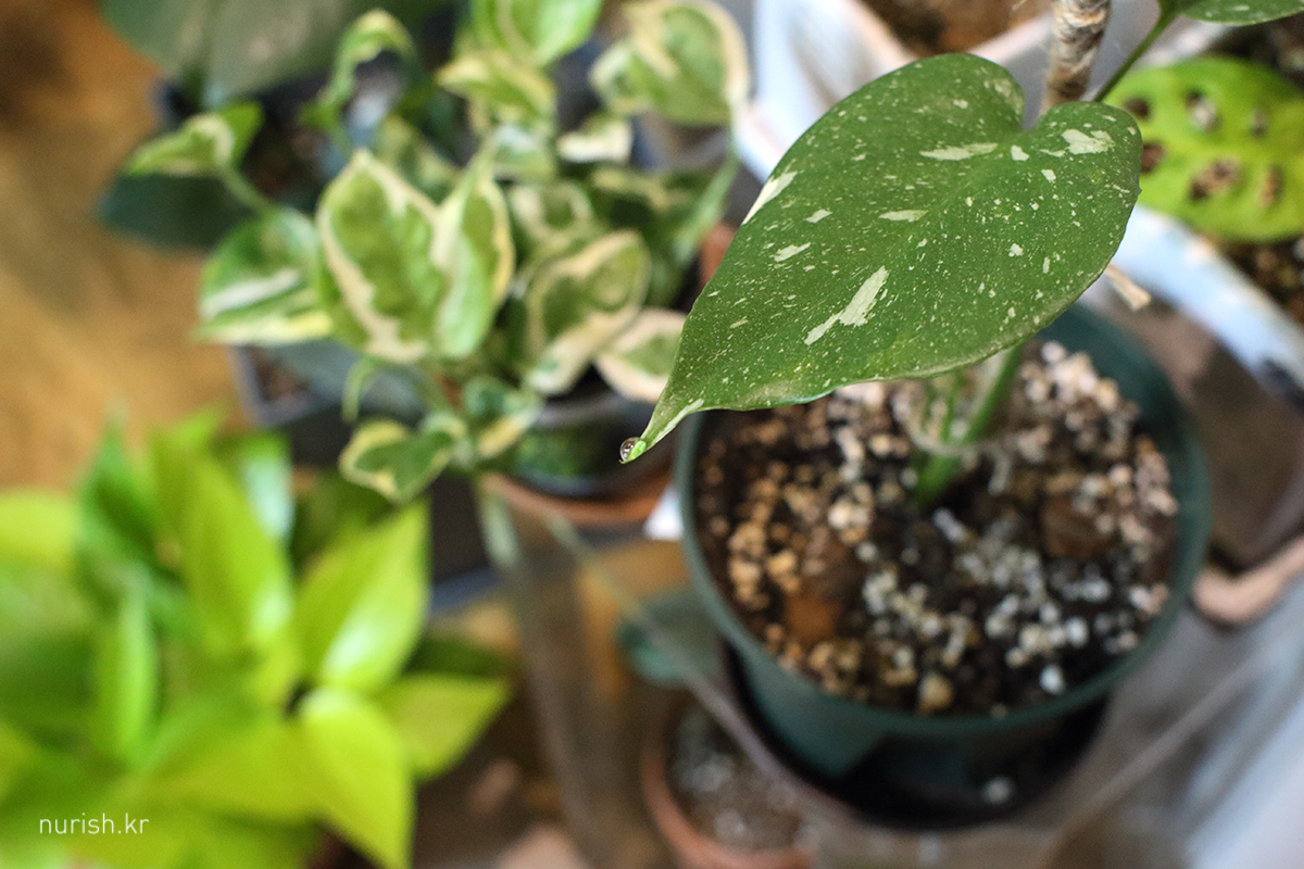 무늬몬스테라(몬스테라 델리시오사 바리에가타). 물방울 또롱