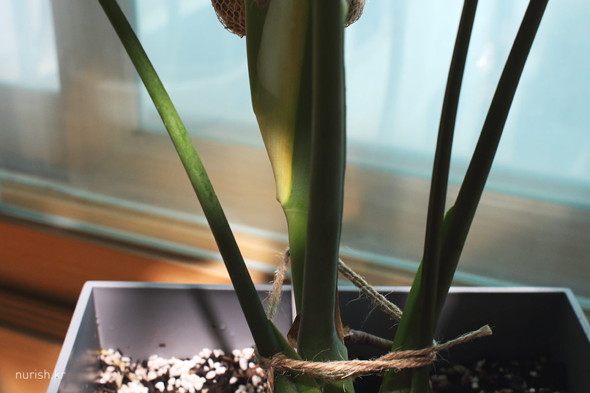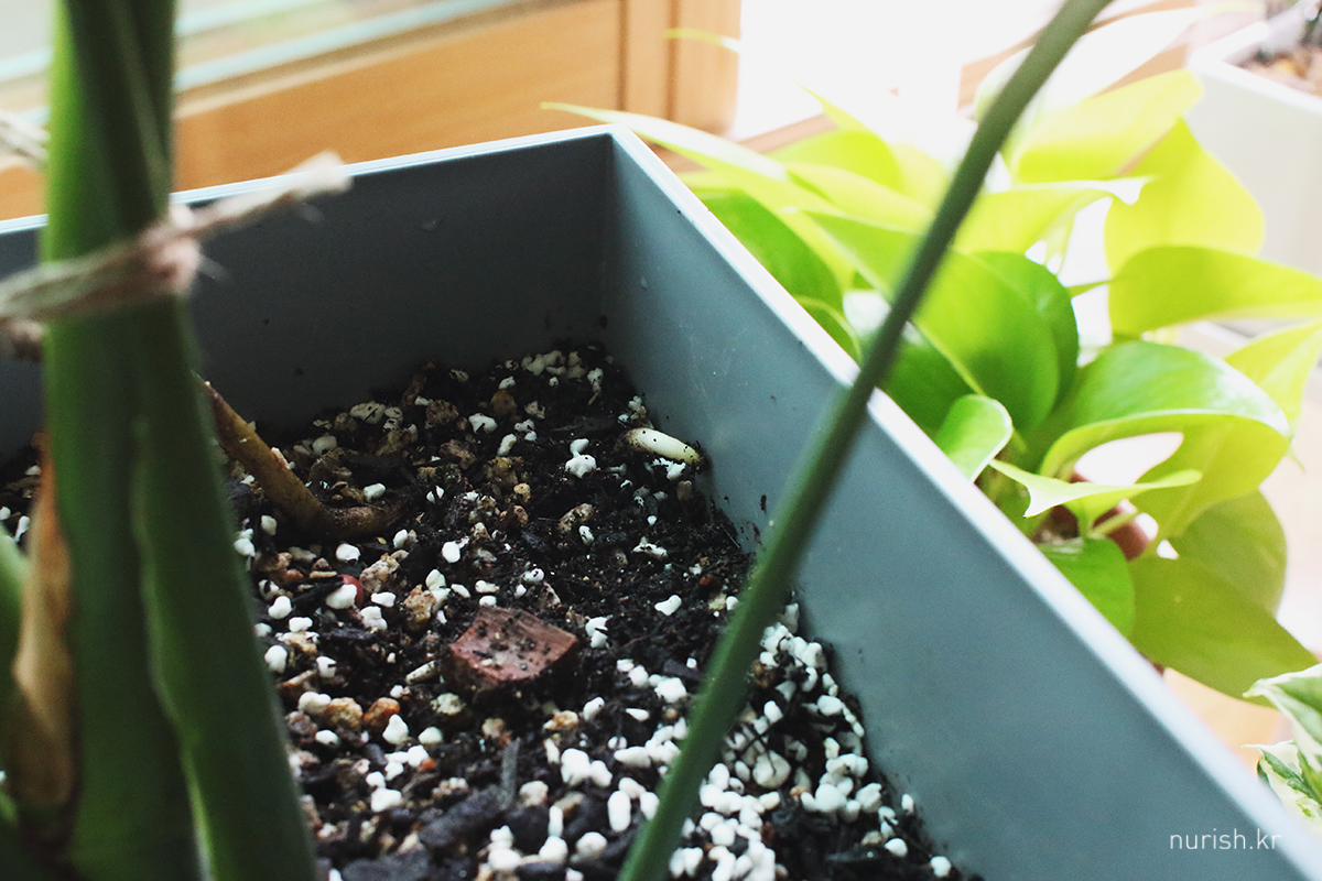 새순이 올라올듯 말듯 얼음이라 걱정이 많았는데 공기뿌리 낼 준비를 하고 있었던 몬스테라 :D