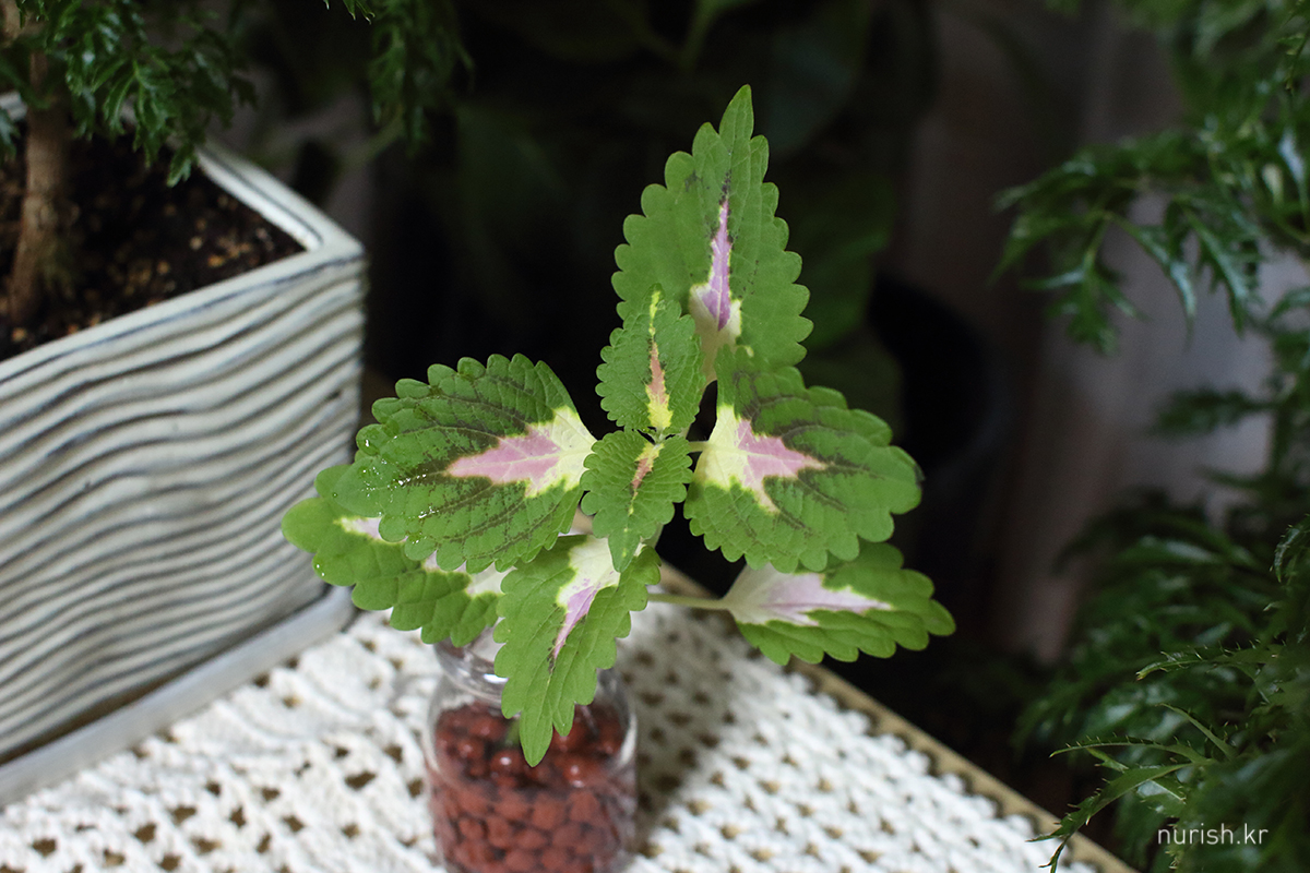 오레우스와 마블퀸은 당근으로 들였는데, 콜레우스 삽수를 하나 나눔해 주셨다. 병에 꽂아 놓으려는데 고정이 안 되어서 황토볼의 도움을 받았다. 순둥이라는데 뿌리가 잘 나면 좋겠다. 뿌리내리기 매번 실패해서 자심감 하락 중임 ㅠㅠ 엔조이 삽수도 같이 주셨는데 수경재배 중인 한 포기랑 대충 합사시켜 놔서 사진을 못 찍었다. 정리 좀 해야지.