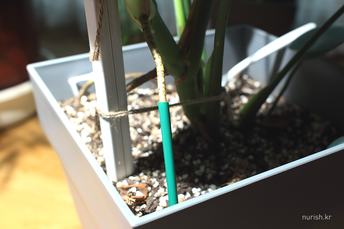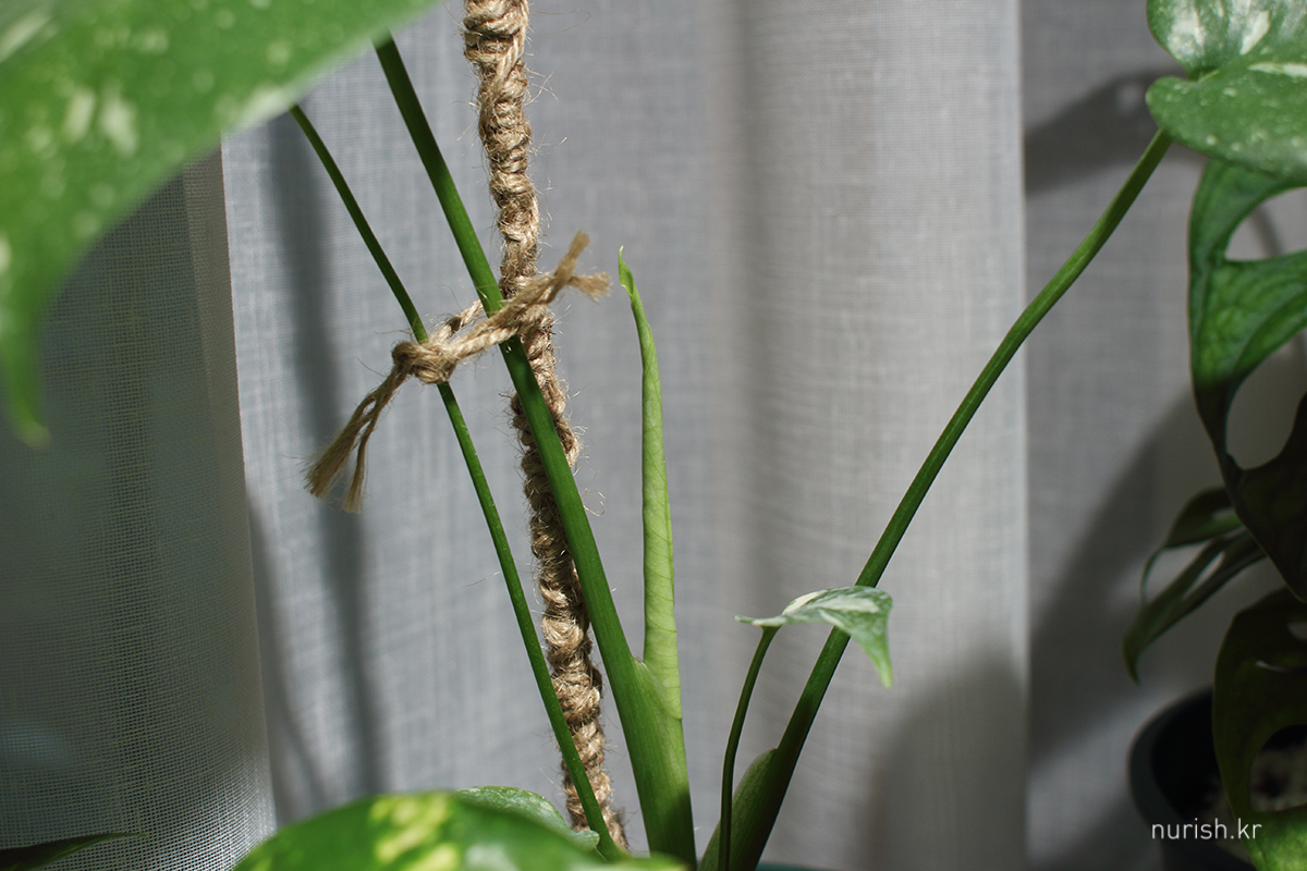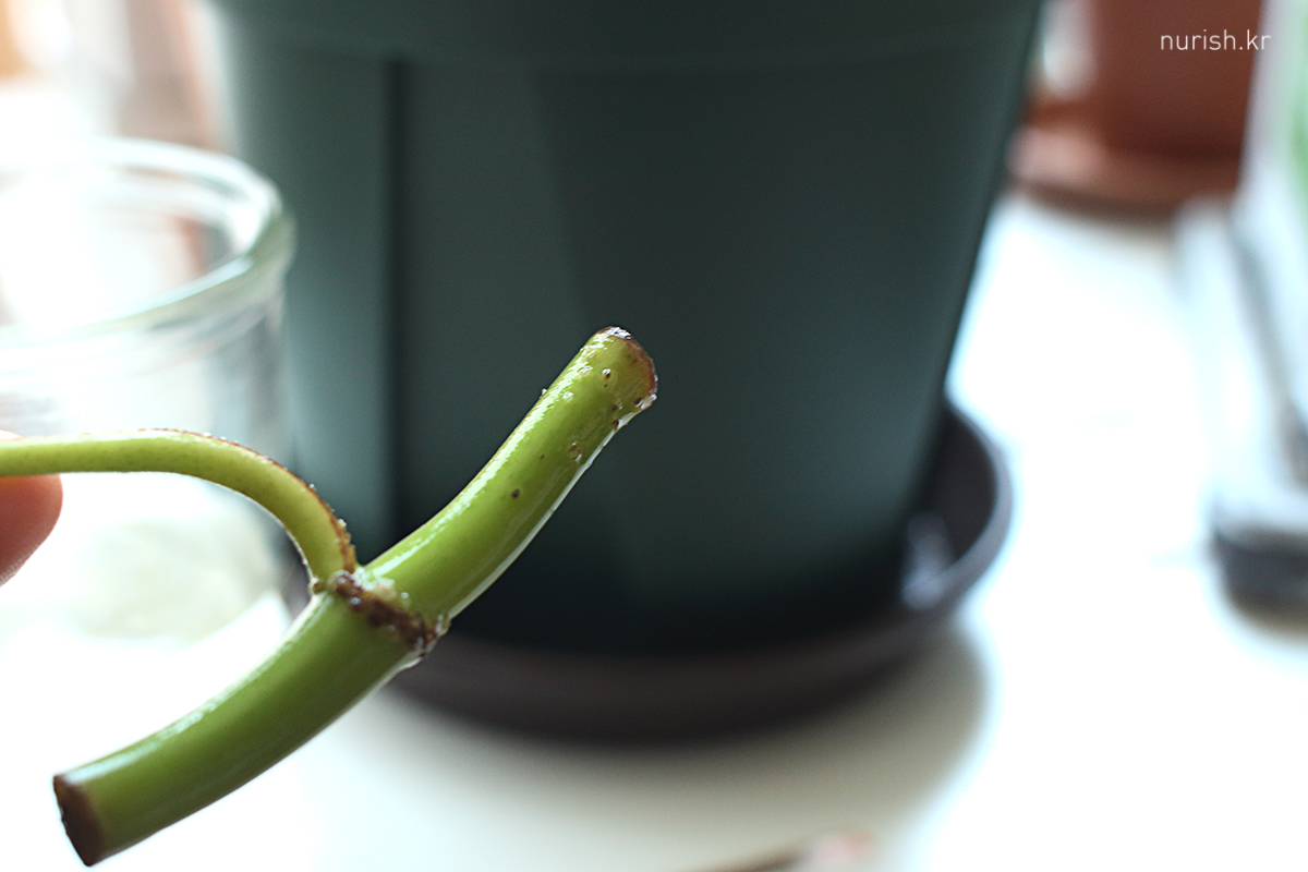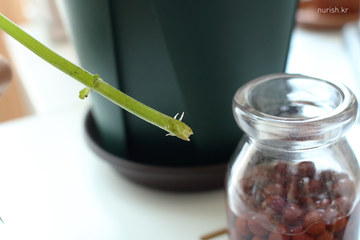 자주 들락날락하는 식물카페에서 공기뿌리에 투명 빨대를 대주면 공기뿌리를 흙으로 보내기도 쉽고 뿌리가 마르지도 않는다는 꿀팁을 보았다. 이것 때문에 투명 빨대를 새로 사기는 좀 그래서 22일 목요일 저녁, 집에 굴러다니던 초록색 빨대로 감싸주었다.