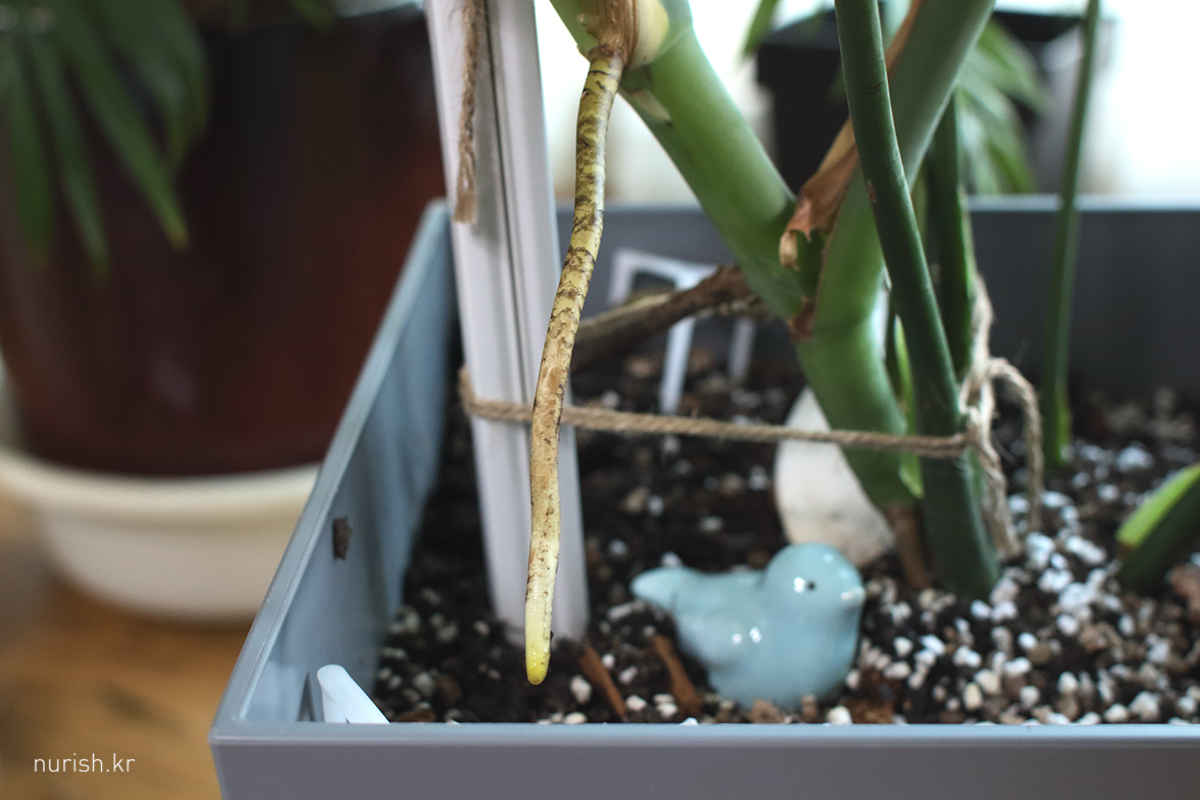 새잎 크기가 자꾸 작아지는 게 화분이 작아서 그런 건 아닌가 싶어서 18cm 화분으로 분갈이를 했다. 뿌리가 꽉 차 있더라. 분갈이하는 과정에서 몇 개 부러뜨려서 슬펐다. 공기뿌리도 잘 나고 있는데, 저 삐죽한 건 새순일까?