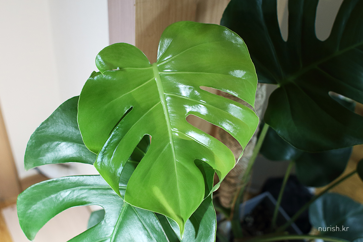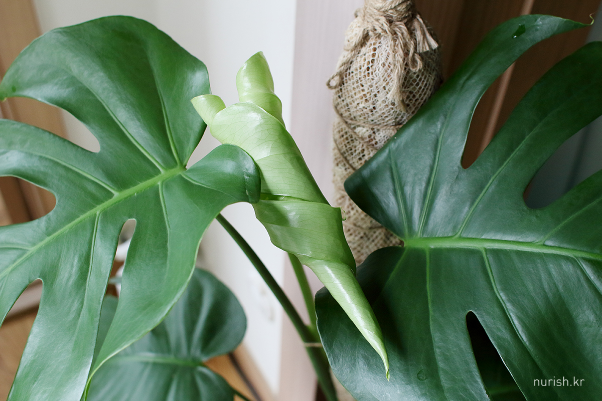 윤기 좌르르르 연두색 이파리. 찢어진 부분이 이번에는 다섯 군데! 잎 펼쳐질 때마다 찢어진 부분이 한 군데씩 늘어나는 것도 너무 신기하다. 언제 다 자라서 콧구멍도 내주려나 ㅎㅎㅎㅎㅎ