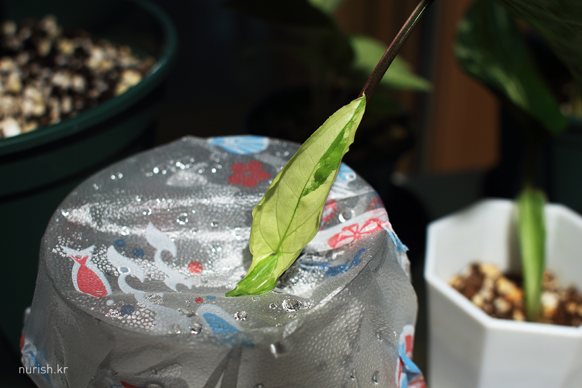 물꽂이 중에 새순도 하나 자라서 잎이 펴져 있었다. 크기는 작지만 무늬가 좋다. 오늘 내일은 너무 바빠서 목요일에 흙으로 옮겨줘야지.