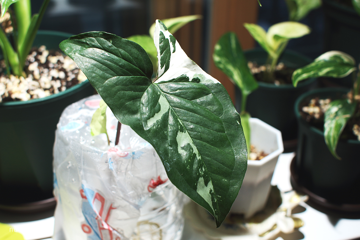 데려올까 말까 진짜 고민 많이 했던 무늬 싱고니움. 그런 와중에 초록창 식물 카페에서 토끼 귀가 생긴 성체 모습을 보았고 뿅 반해서 당근에서 좋은 기회를 잡았다. 아 귀여워. 집에 있는 싱고니움 미니픽시보다 확실히 잎 크기가 크다.