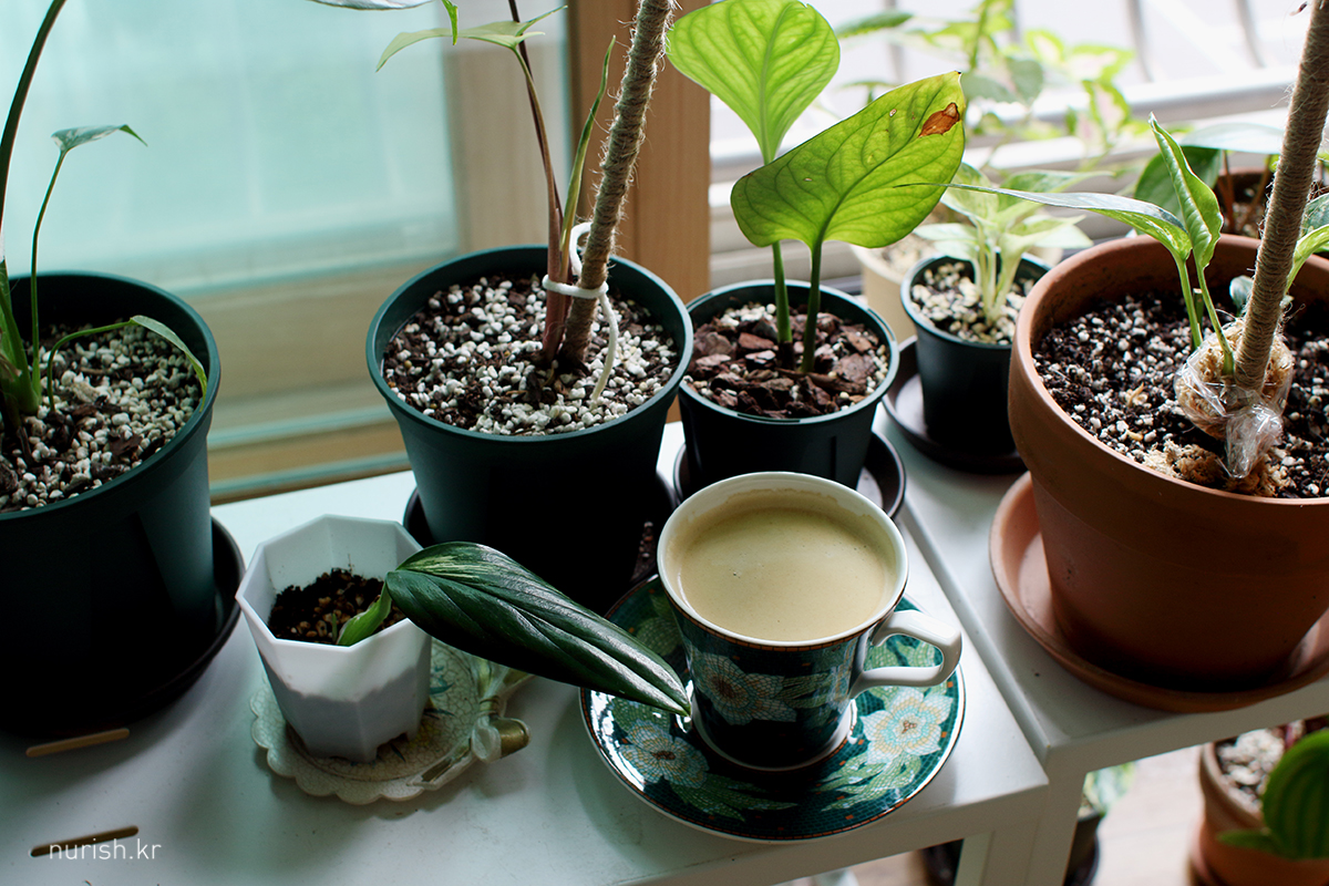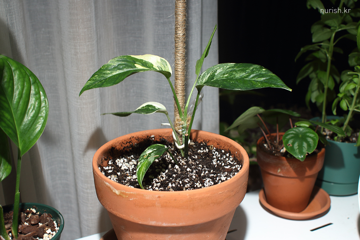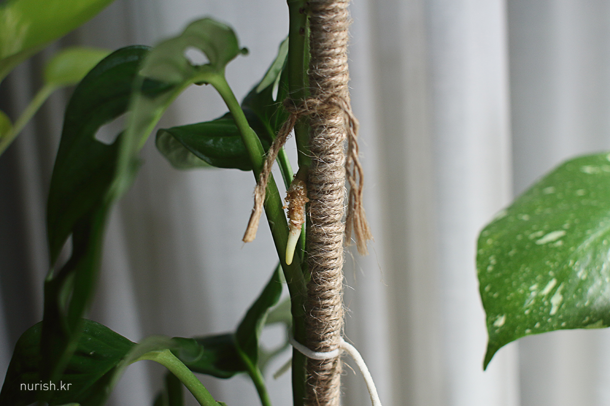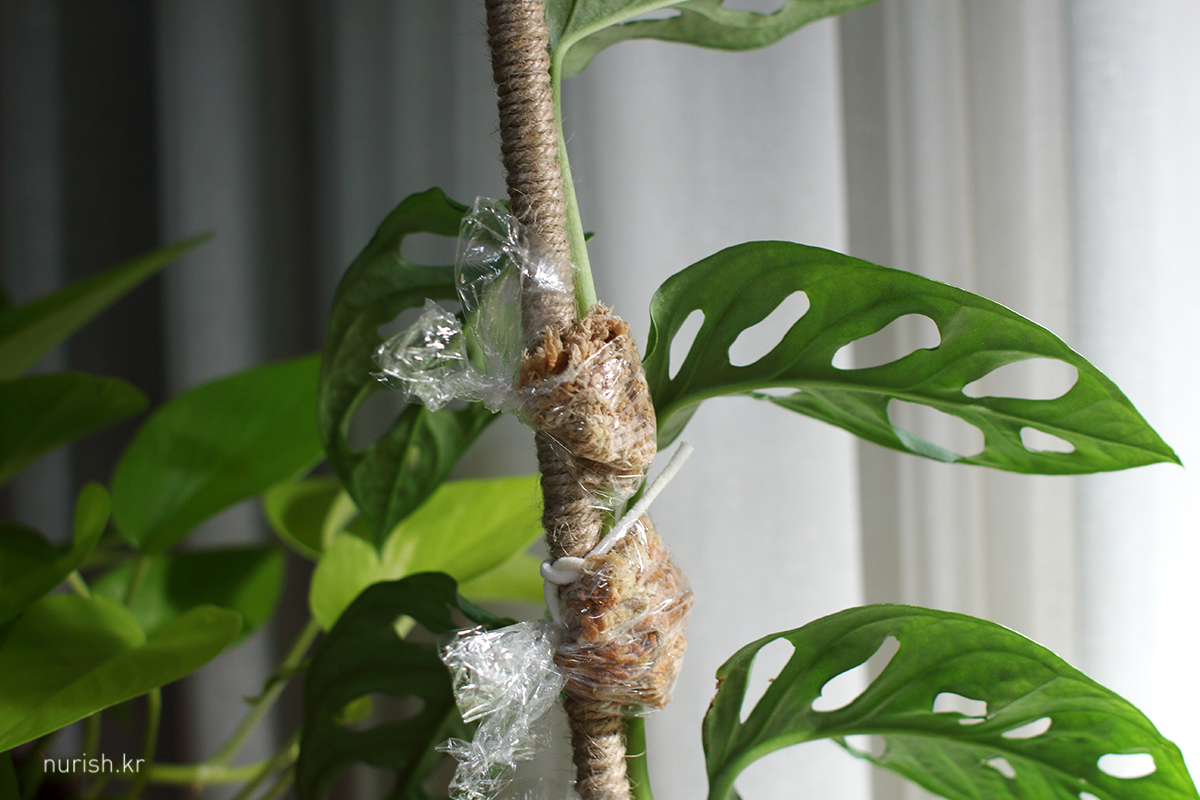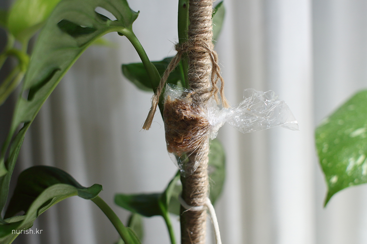 초록창 식물 카페에 아단소니 이파리가 자꾸 작아진다는 고민글을 올렸더니 공기뿌리에 수태랩핑해 주면 잘 자란다고 조언이 있어서, 며칠 전 나도 시도해 보았다. 손끝이 무뎌서 썩 깔끔하지는 않다. ㅋㅋㅋ