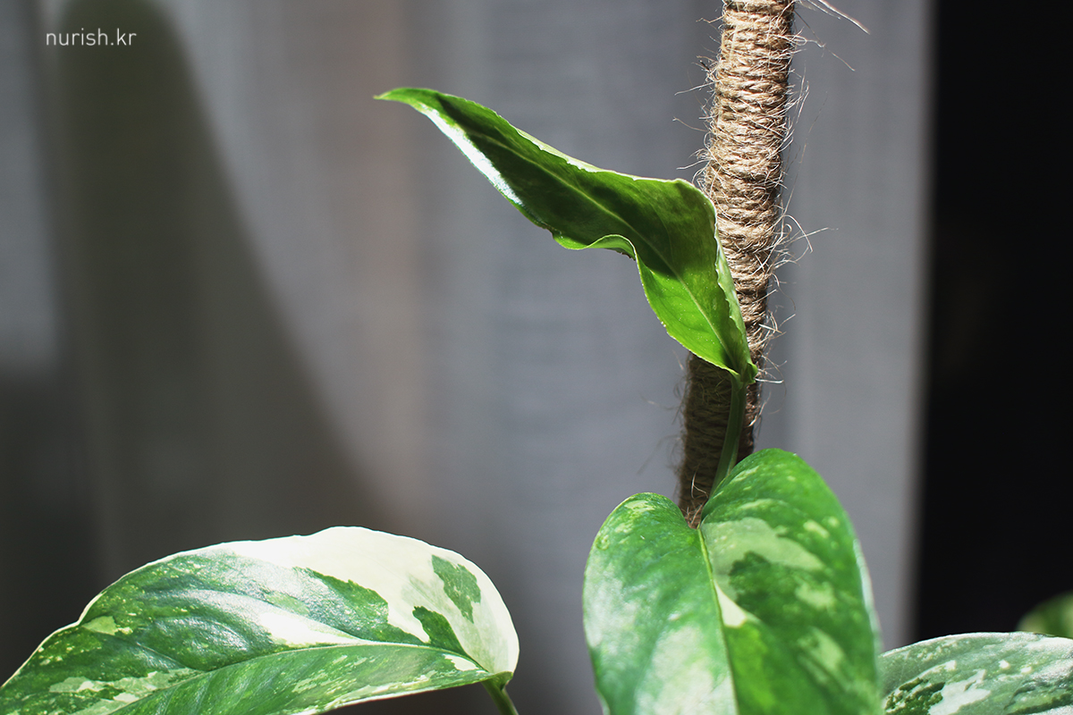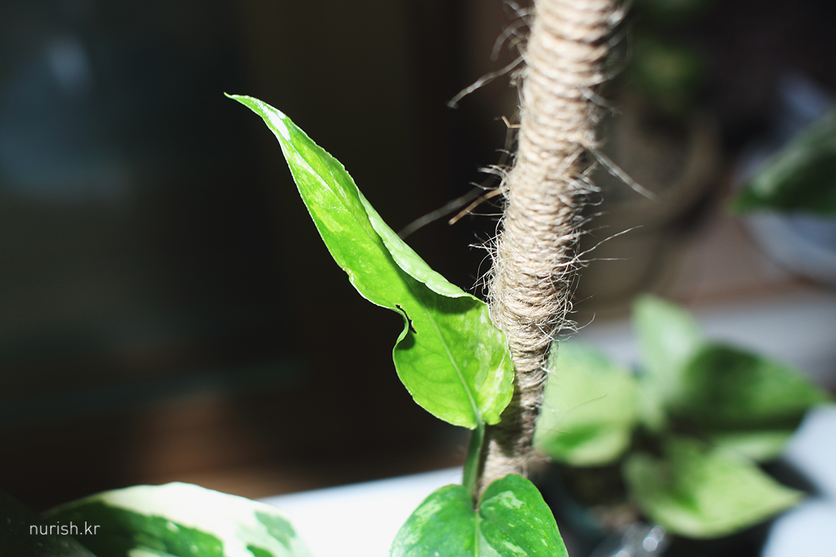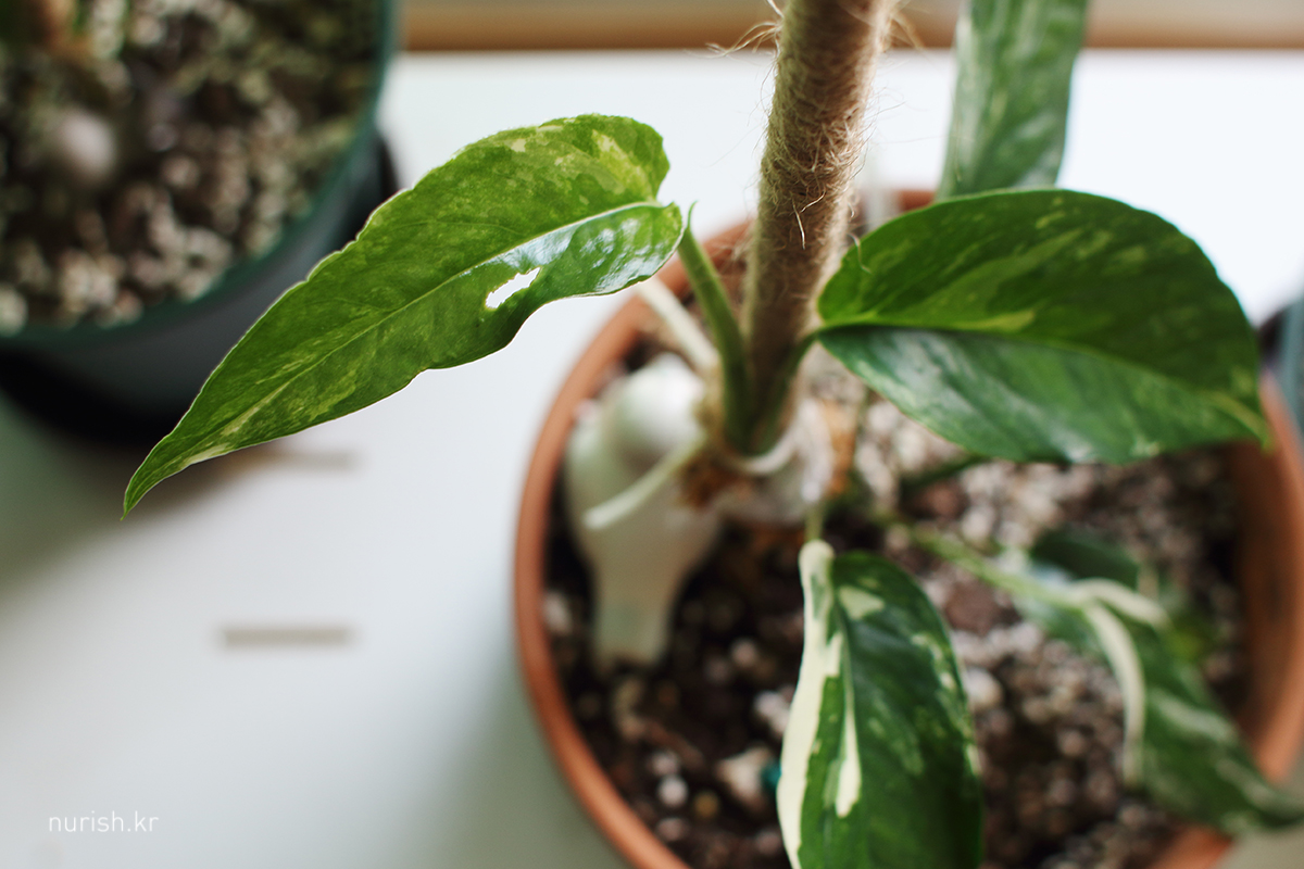 구멍 났어도 새잎은 항상 싱그럽다! 자연광에 찍어서 더 예쁘넴. 히히 근데 저번 잎부터 무늬 어디 갔을까?