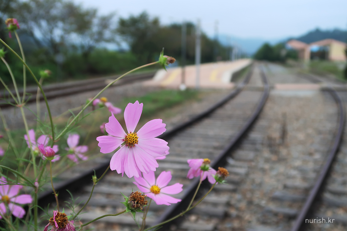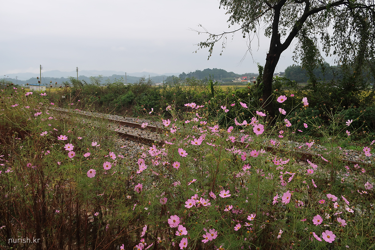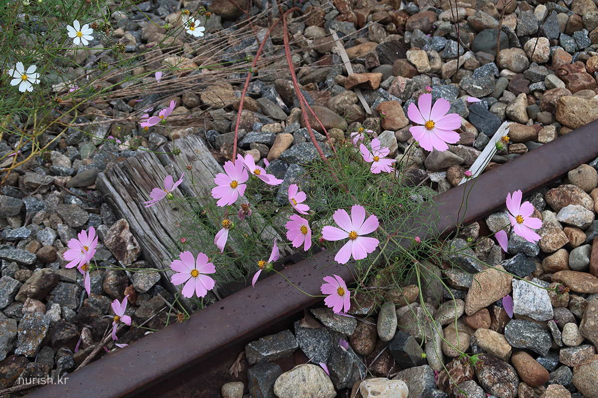 철길에 가을 코스모스 활짝