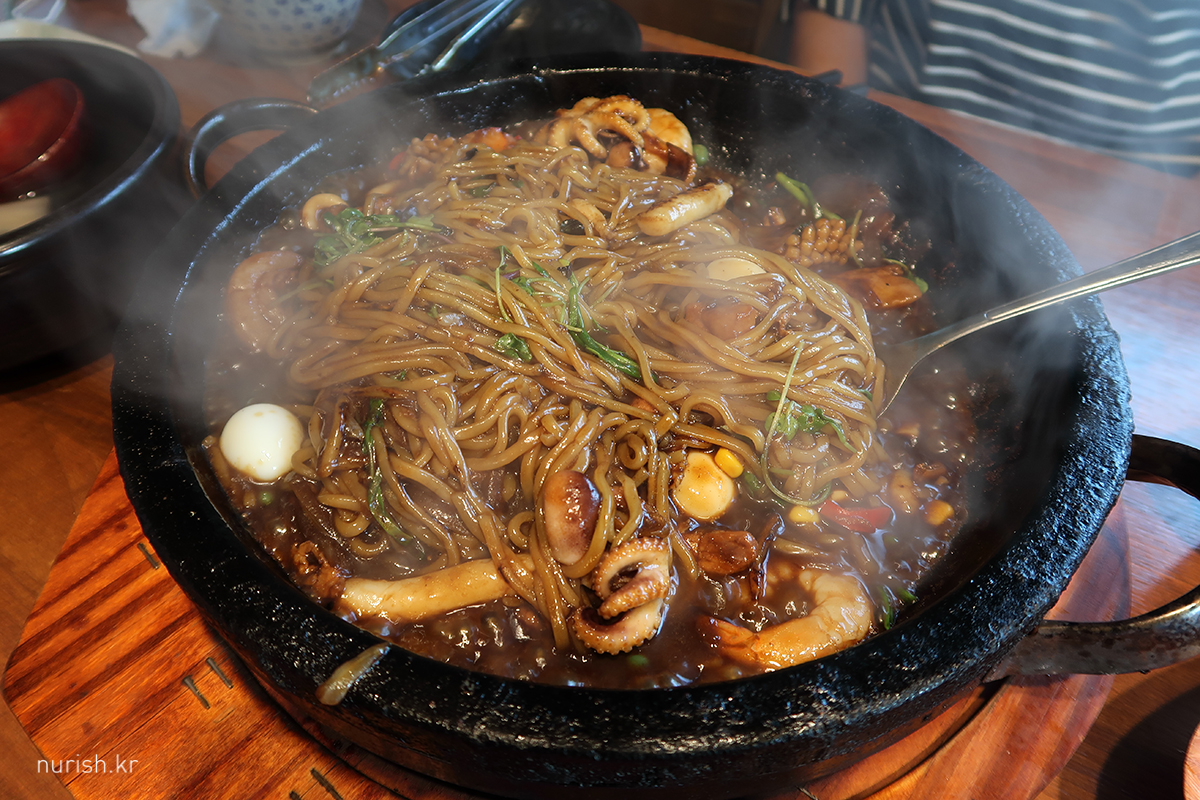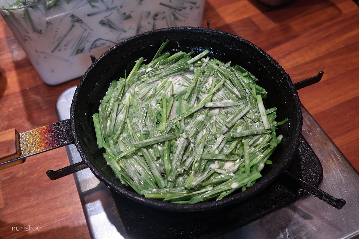 주남저수지돌짜장 식당에서는 이렇게 부추 부침개를 직접 부쳐 먹을 수 있다.