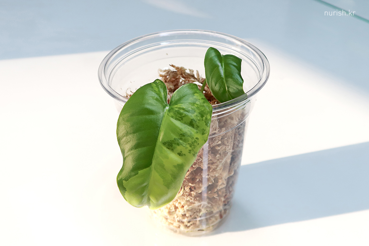 올해 진짜 ㅋㅋㅋ 식쇼핑은 끝이다! 내 지갑이 허락하는 상한선 안의 마지막 위시 필로덴드론 버럴 막스 바리에가타(Philodendron Burle Marx Variegata), 이른바 버막바를 드디어 구했다. 그 동안 유묘로 데려온 애들이 여름 동안 쑥쑥 자라는 바람에 점점 감당하기 어려워져서 어차피 순둥하게 잘 자라는 아이, 작은 유묘로 저렴하게 들여서 천천히 키워야겠다는 꿈을 가졌는데 의외로 이만한 크기의 유묘가 동네 당근에 잘 안 나왔다. ㅠㅠ 버막바 당근은 대부분 무늬 잃은 초록이들뿐ㅠㅠ 몇 달 동안 눈팅하다가 드디어 잎 두 장에 새순 올라오는 중인 유묘 겟! 제일 큰 잎 길이는 약 7cm이다. 요즘 또 렌로(드라마 말고 소설)에 미쳐 있는 관계로, 이름은 예쁘게 잘 자라라는 뜻을 담아 로라스라고 지었다.