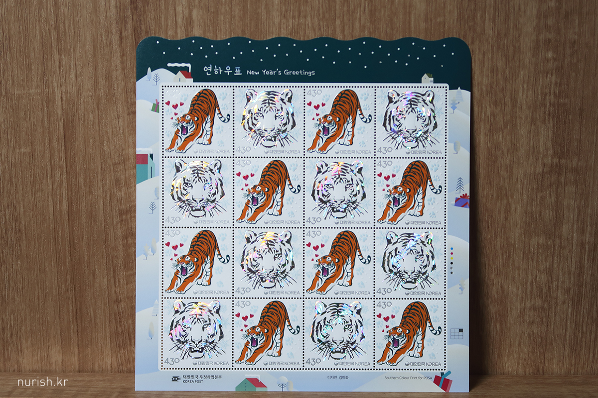 2021년 12월 1일 발행, 검은호랑이해를 맞이하여 호랑이 우표! 디자인은 설경 속 호랑이와 호랑이 기운이 솟는 새해라고 한다.