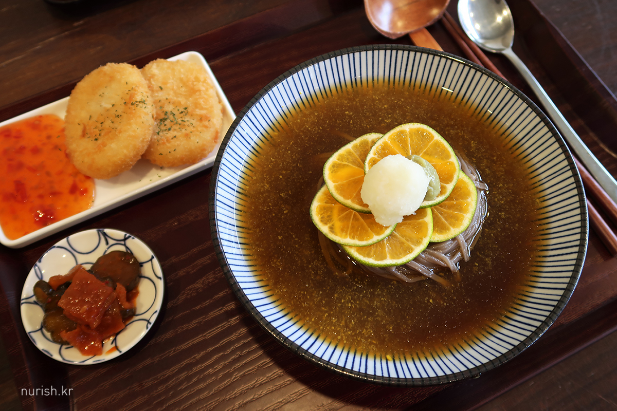 이 집 대표 메뉴인 청귤소바, 거기에 새우감자고로케 추가