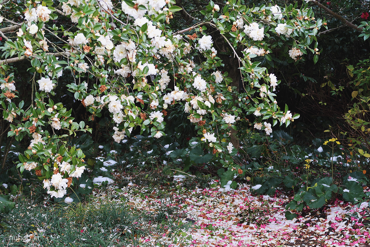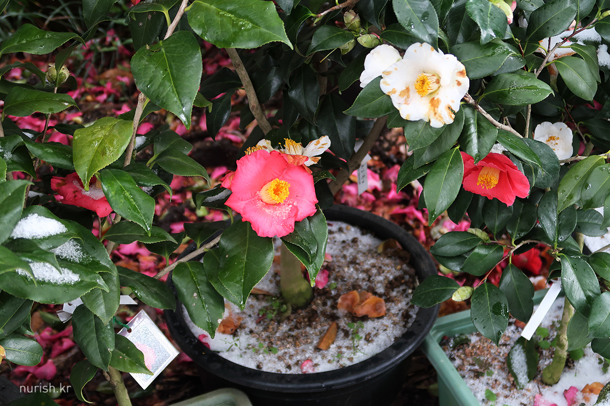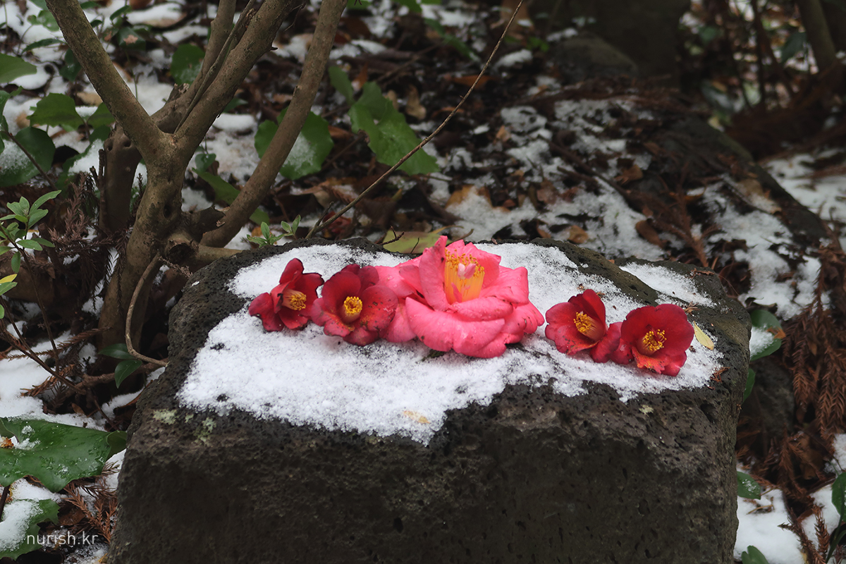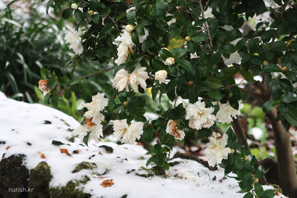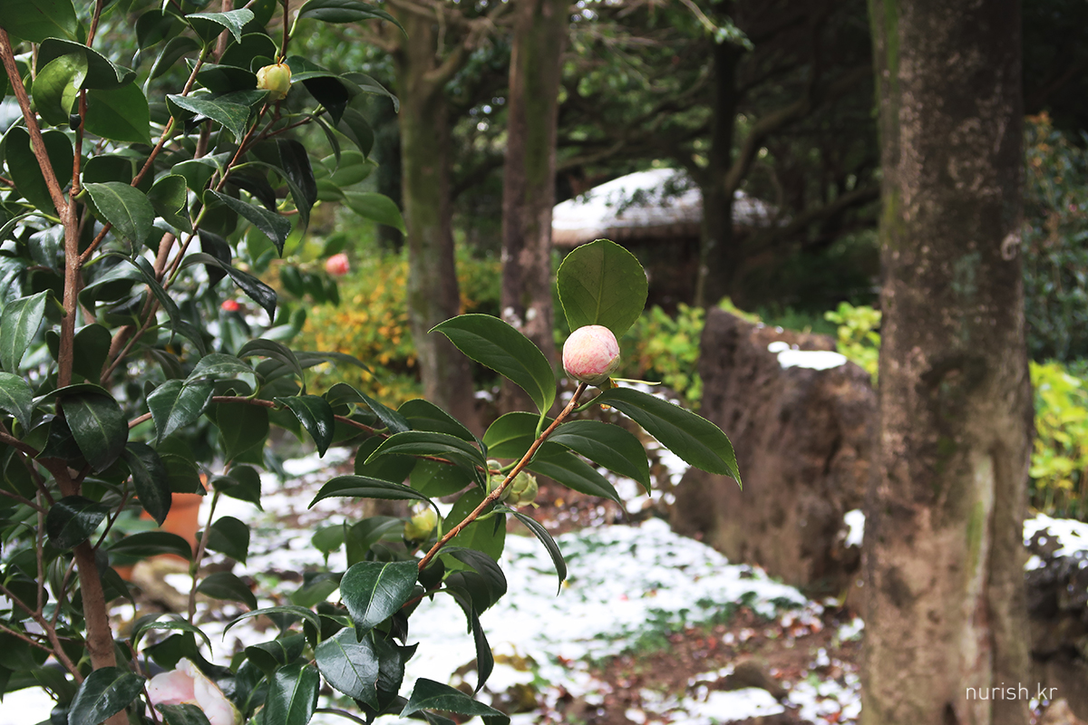 어제처럼 눈보라가 몰아치진 않아서 카멜리아힐에 왔다. 눈은 여전히 내리는 중.