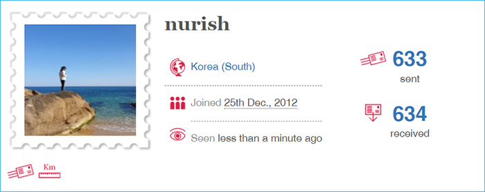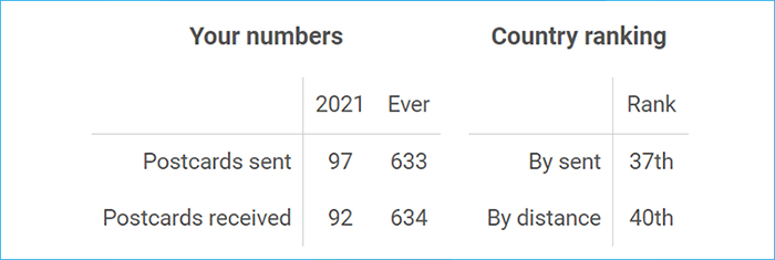 내가 보내서 상대방에게 닿은 엽서는 97통, 현재 여행 중인 엽서 19통, 보낸지 60일 지나서 만료/expired/된 엽서 16통.