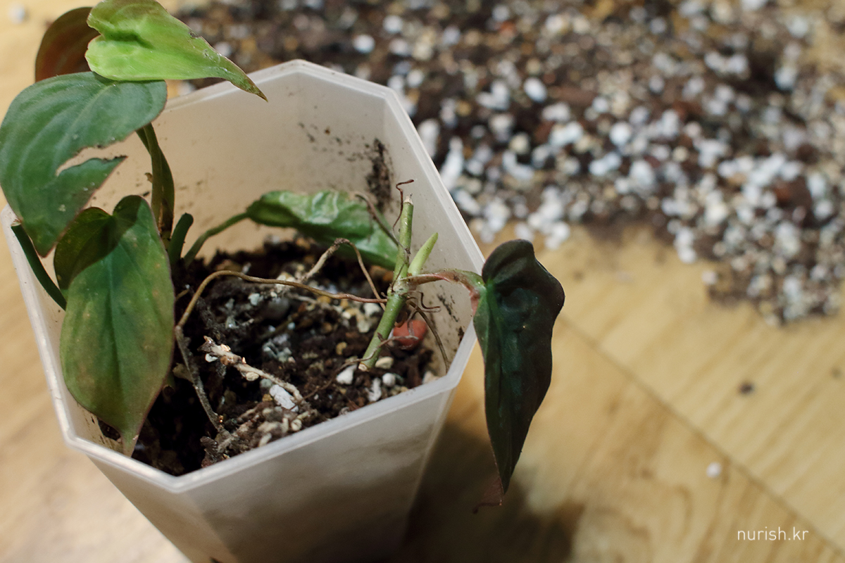 다시 심는 과정에서 하나 있는 잎을 잘라 먹어서ㅠㅠㅠ 새순이 잘 살아남을 수 있을까? 미칸의 생명력만 믿는 중