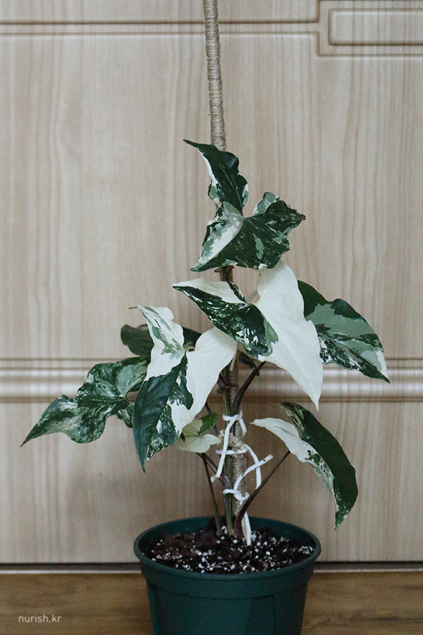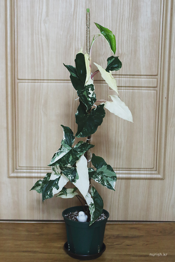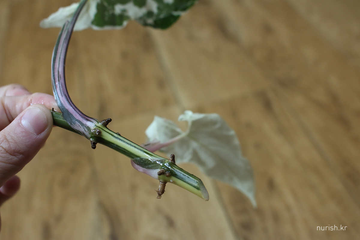 2021년 8월 9일, 물꽂이해서 갓 순화 끝난 싱고니움 삽수 들인지 약 168일. 생각보다 훨씬 잘 자라 주었지만 위쪽 무늬도 마음에 안 들고, 촉 여러 개로 풍성하게 키우고 싶어서 가위를 들기로 했다.