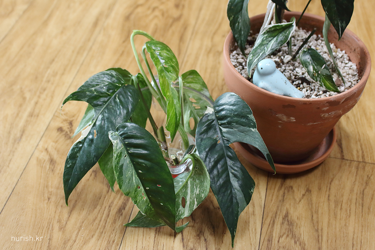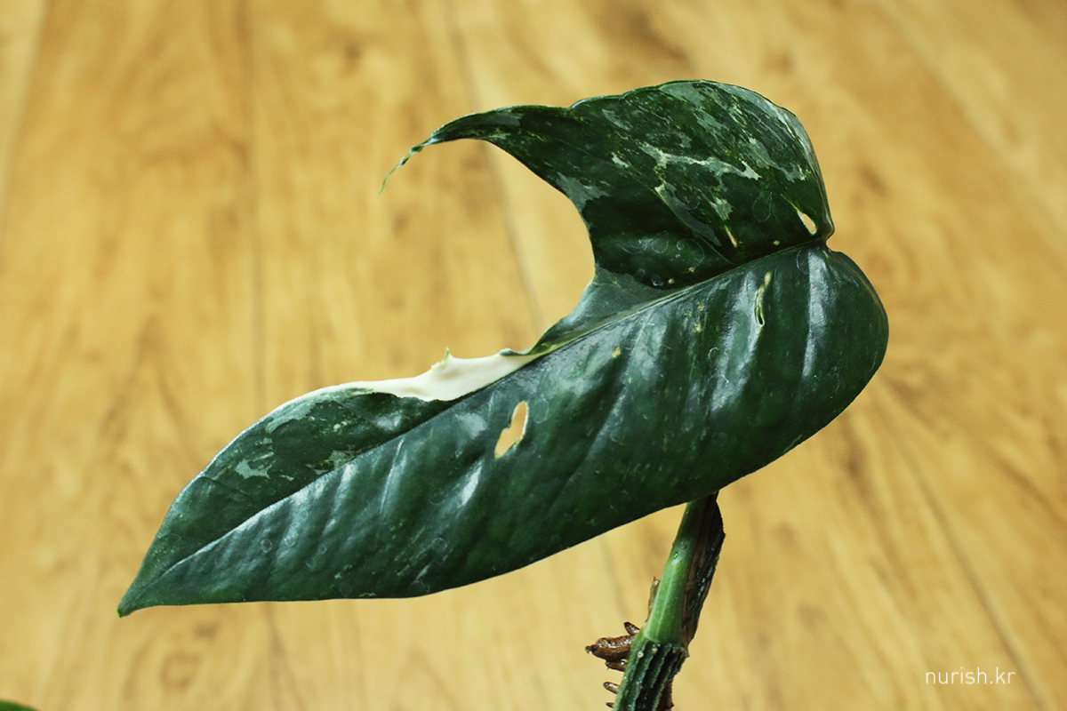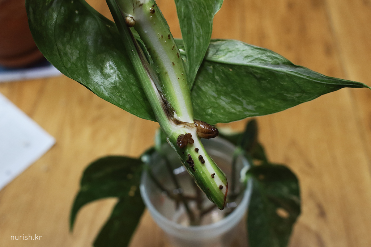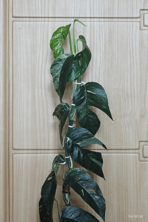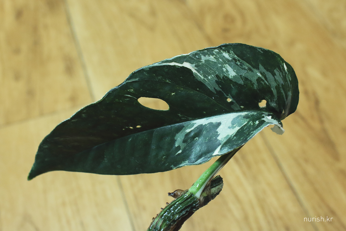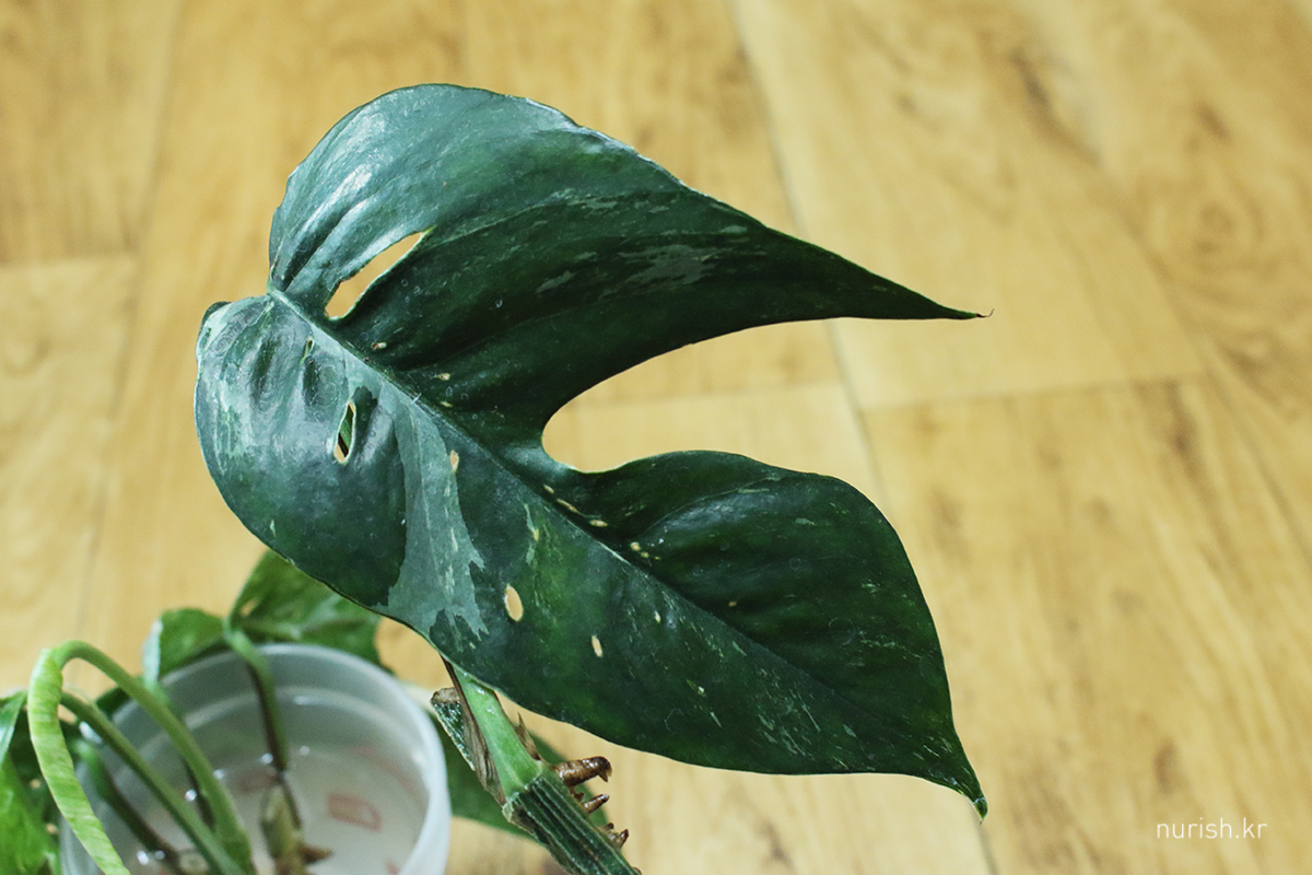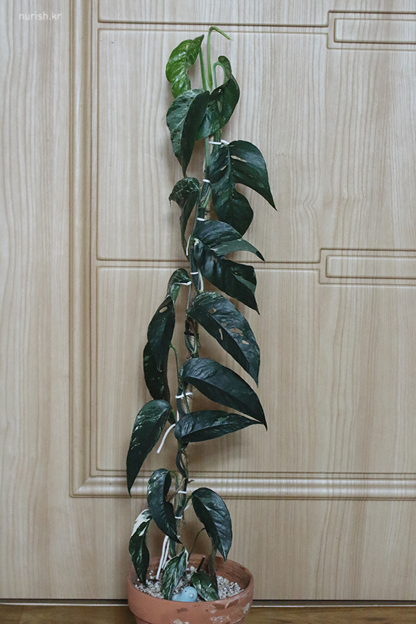 이렇게나 잘 자랐다. 구멍잎도 나고 찢잎도 나고 벌브도 두꺼워지고. 단지 아쉬운 건 무늬, 무늬, 무늬ㅠㅠ 초록인지 바리에가타인지 알 수가 없네. ㅋㅋㅋ 줄기가 지지대 넘어서면서 새잎은 동강 부러지고ㅠㅠㅋㅋ 지지대를 더 긴 걸로 바꿀까 어쩔까 하다가 무싱이랑 같이 과감하게 커팅 도전해 보기로 했다. 무늬 자극도 주고, 촉 여러 개 만들어서 풍성하게 키워야지.