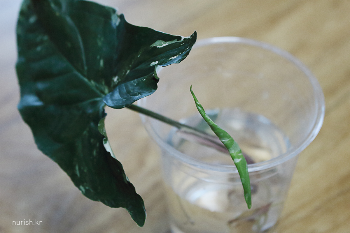 뿌리 잘 나고 있다. 탑삽수의 가장 최신 잎에 있던 돌돌이 새순이 까맣게 녹아버려서 잎 하나 잘라 버렸다. ㅠㅠ