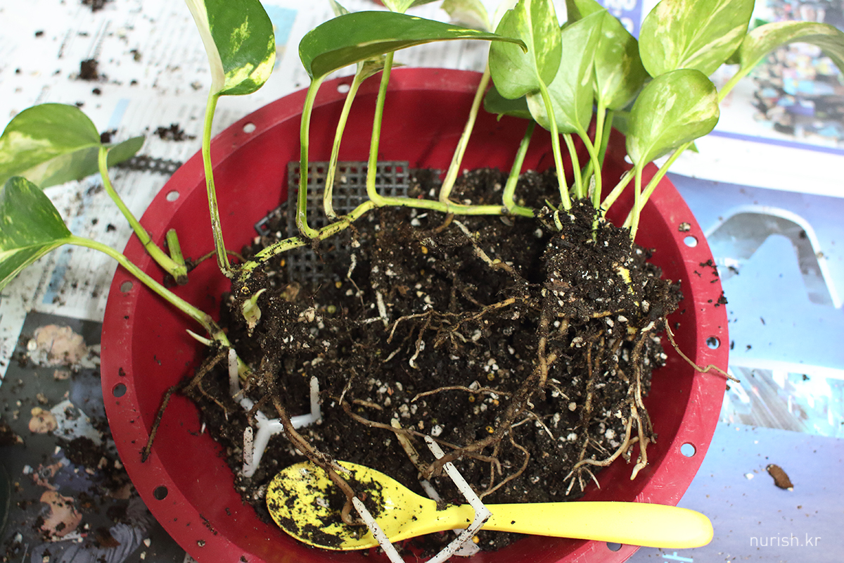 뿌리가 물구멍으로 많이 튀어나와서 엎어봤는데, 휘묻이했던 마디에서 부리들이 엄청 자라 있었다. 몬스테라처럼 뿌리 양이 많은 건 아니라서 안 튀어나오게 정리하여 그대로 다시 화분에 담았다. ㅋㅋ