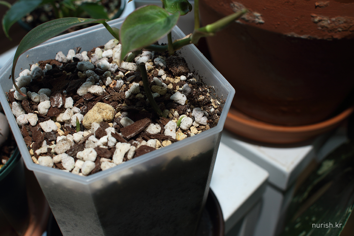 드디어 새순이 흙을 뚫고 지상으로 ㅋㅋㅋ 보통 잘 자라는 식물로 스킨답서스 추천하는데 우리집에서는 느려도 너무 느리다.