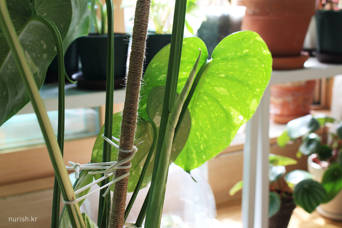 우리집 몬스테라들이 너나 할 것 없이 줄지어 새잎을 올리기 시작했다. 한창 벌레에 예민하던 때 벌레 알인 줄 알고 박박 문질렀다가 잎집 부분 까맣게 변해버렸는데 새잎에는 영향을 주지 않아서 다행이다. ㅜㅜ