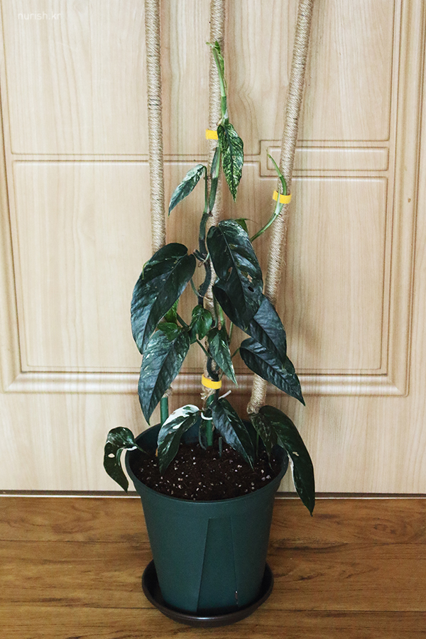 아단소니를 풍성하게 키우기 위하여 지지대를 두 개 꽂았다. 헬라 바텀과 로키, 아랫쪽 하엽 져서 텅빈 마디들은 흙에 둘둘 말아 묻었고, 새순 올라오기 시작한 삽수 두 개를 합식했다. 이제 열심히 자랄 일만 남았네. 희희