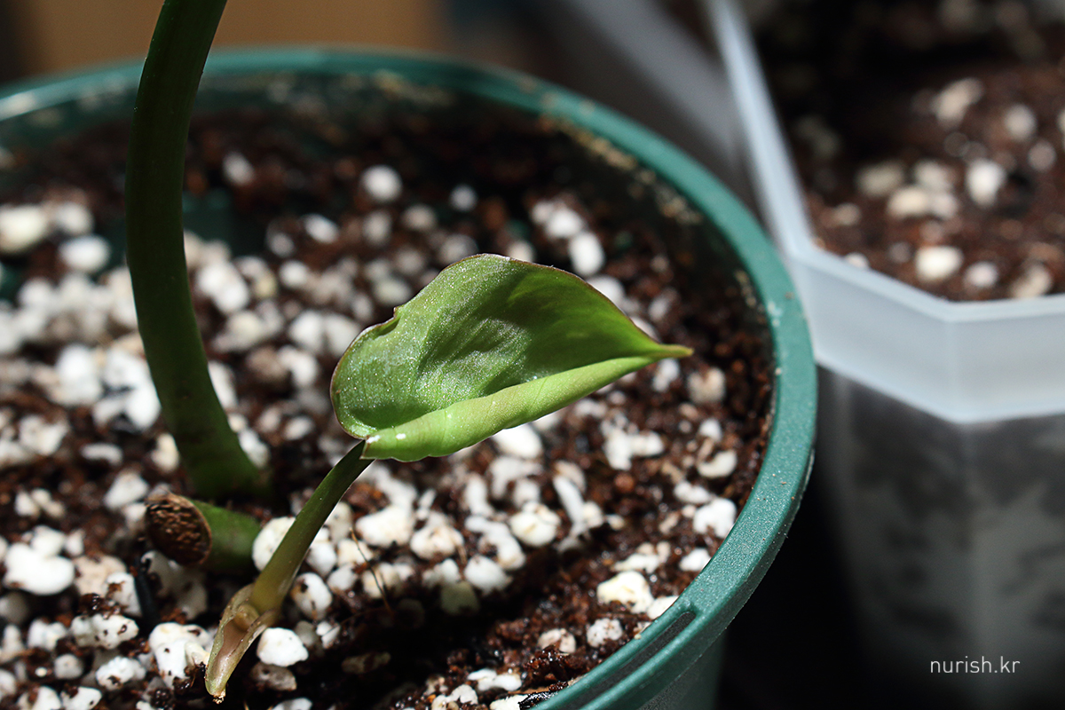 극강의 생명력! 두 번째 새잎도 예쁘게 펴졌다. 초록은 스쳐 지나갔을 뿐. 어째 뿌리 잘 나고 초록 많이 묻은 삽수보다 속도가 빠른 것 같은? ㅋㅋㅋㅋㅋ 고스트 싱고