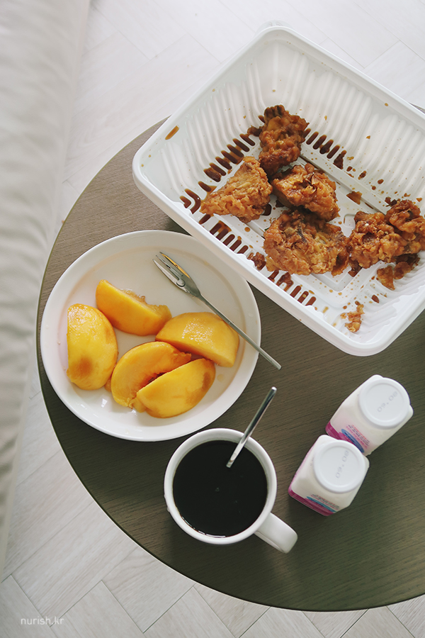 어젯밤 먹다 남은 간장치킨ㅋㅋㅋ이랑 복숭아로 가볍게 배 채우고,