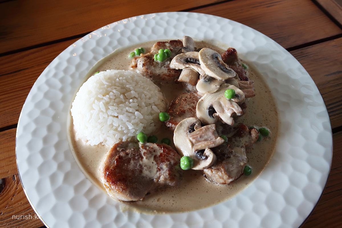 "포크 메달리언" 크리미한 버섯 솟스를 곁들인 제주산 흑돼지 안심 요리