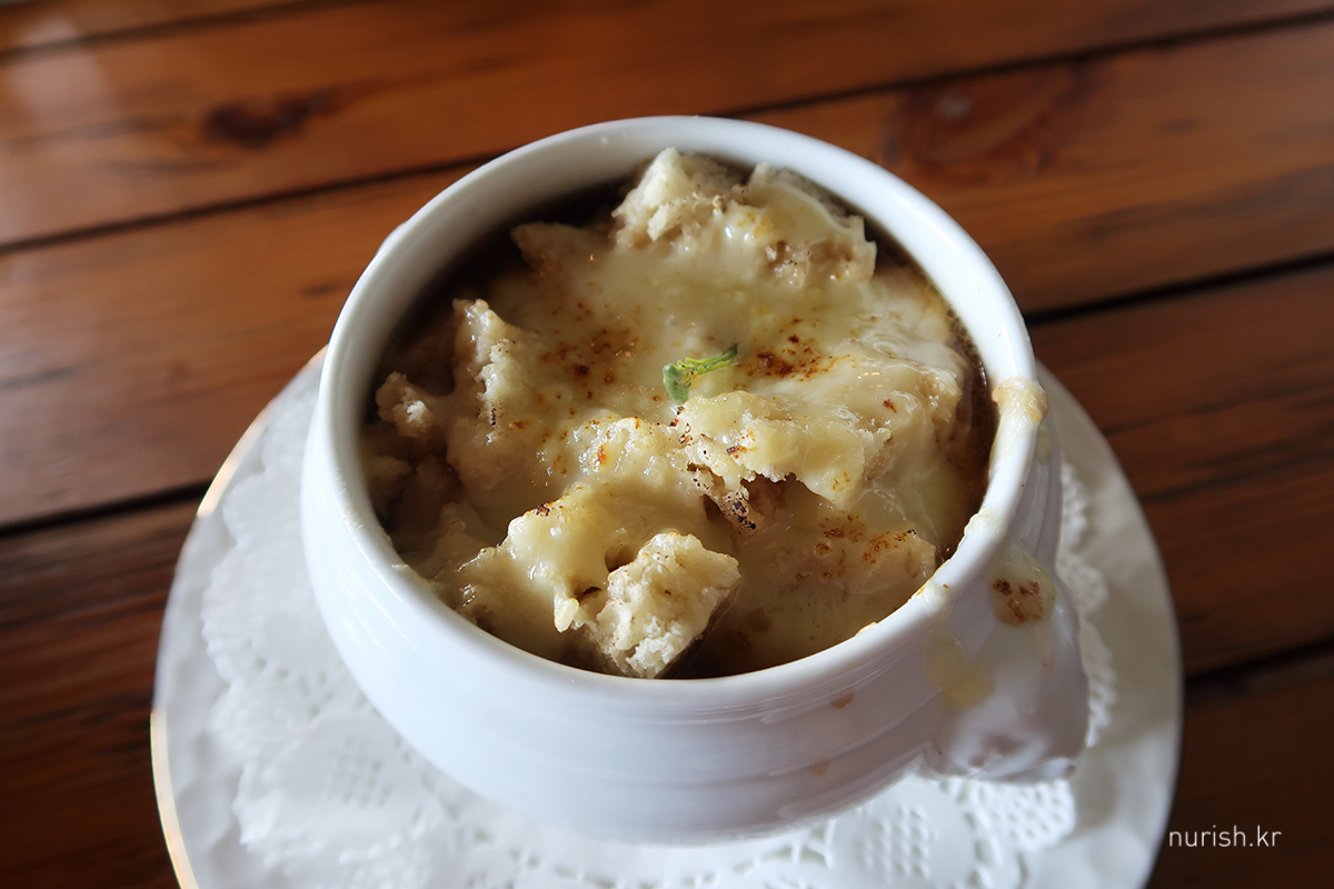 "프렌치 어니언 수프" 갑자기 양파 수프도 먹고 싶어져 가지고 ㅋㅋㅋ 근데 주문을 늦게 해서 스타터가 아니라 후식으로 먹었다. 배만 덜 불렀으면 빵도 같이 먹었으면 좋았을 텐데.